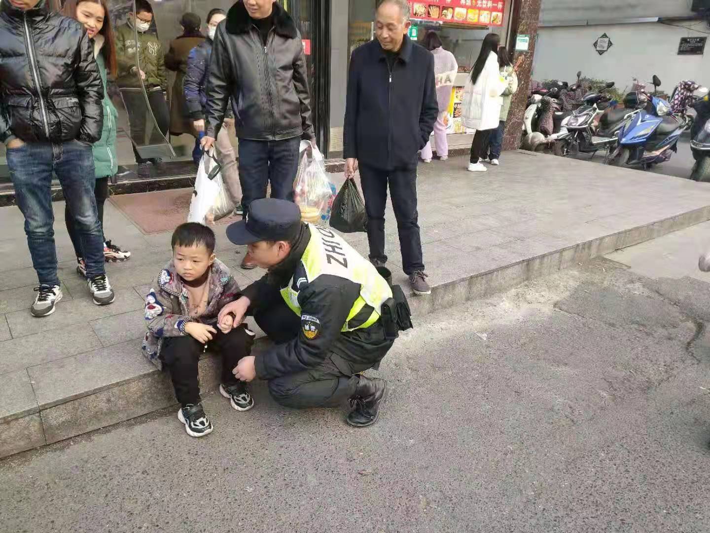 當(dāng)天15:45,李冠峰、李響在東湖北路永旺菜市場值勤時,發(fā)現(xiàn)一個男孩坐在路邊,神情緊張,茫然無措,周圍也沒有大人看管。
