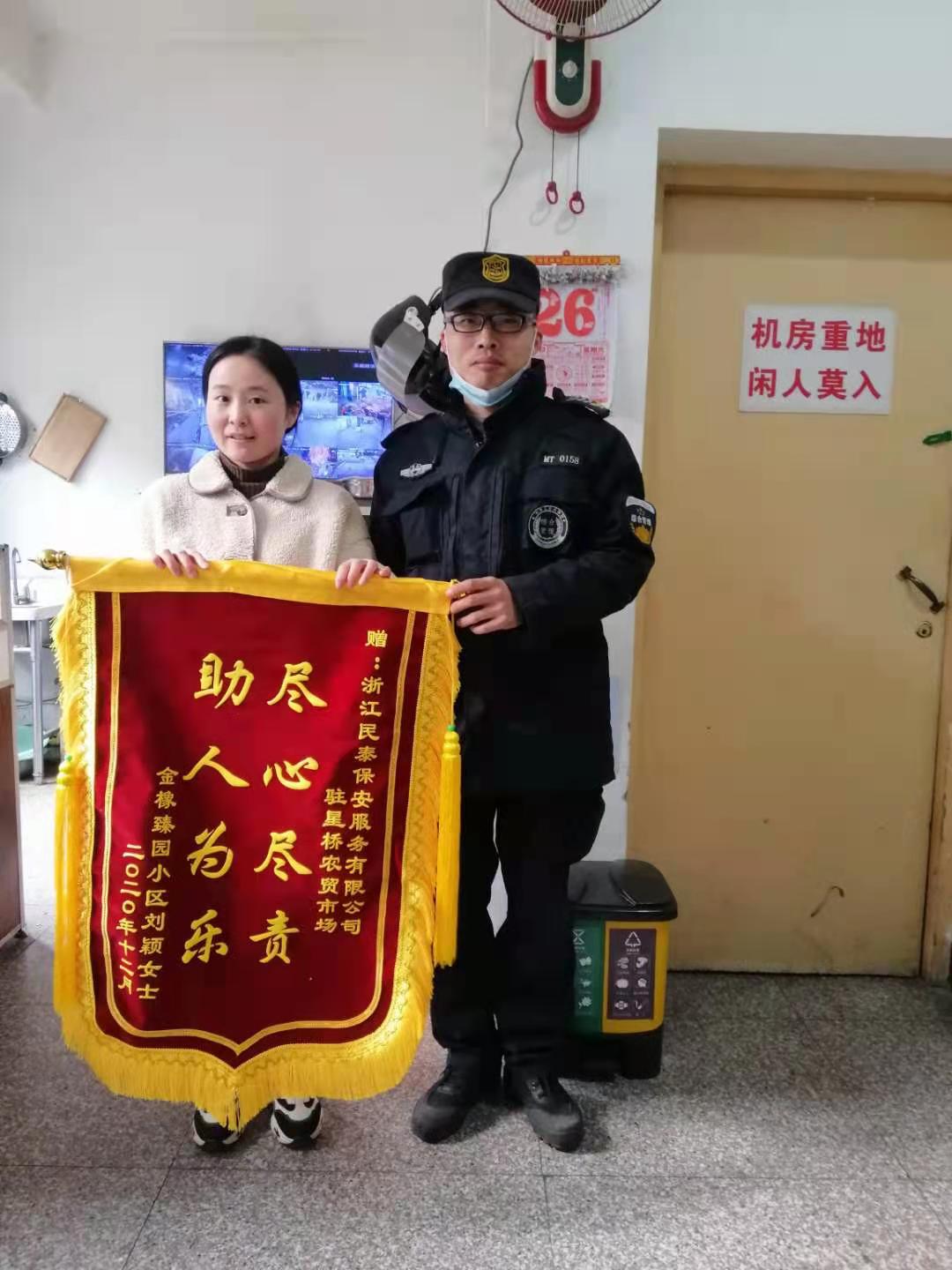 12月21日,星橋農(nóng)貿(mào)市場(chǎng)項(xiàng)目隊(duì)員楊斌收到市民劉穎女士送來的一面繡有“盡心盡責(zé) 助人為樂”的錦旗,感謝楊斌為她找到了手機(jī)。