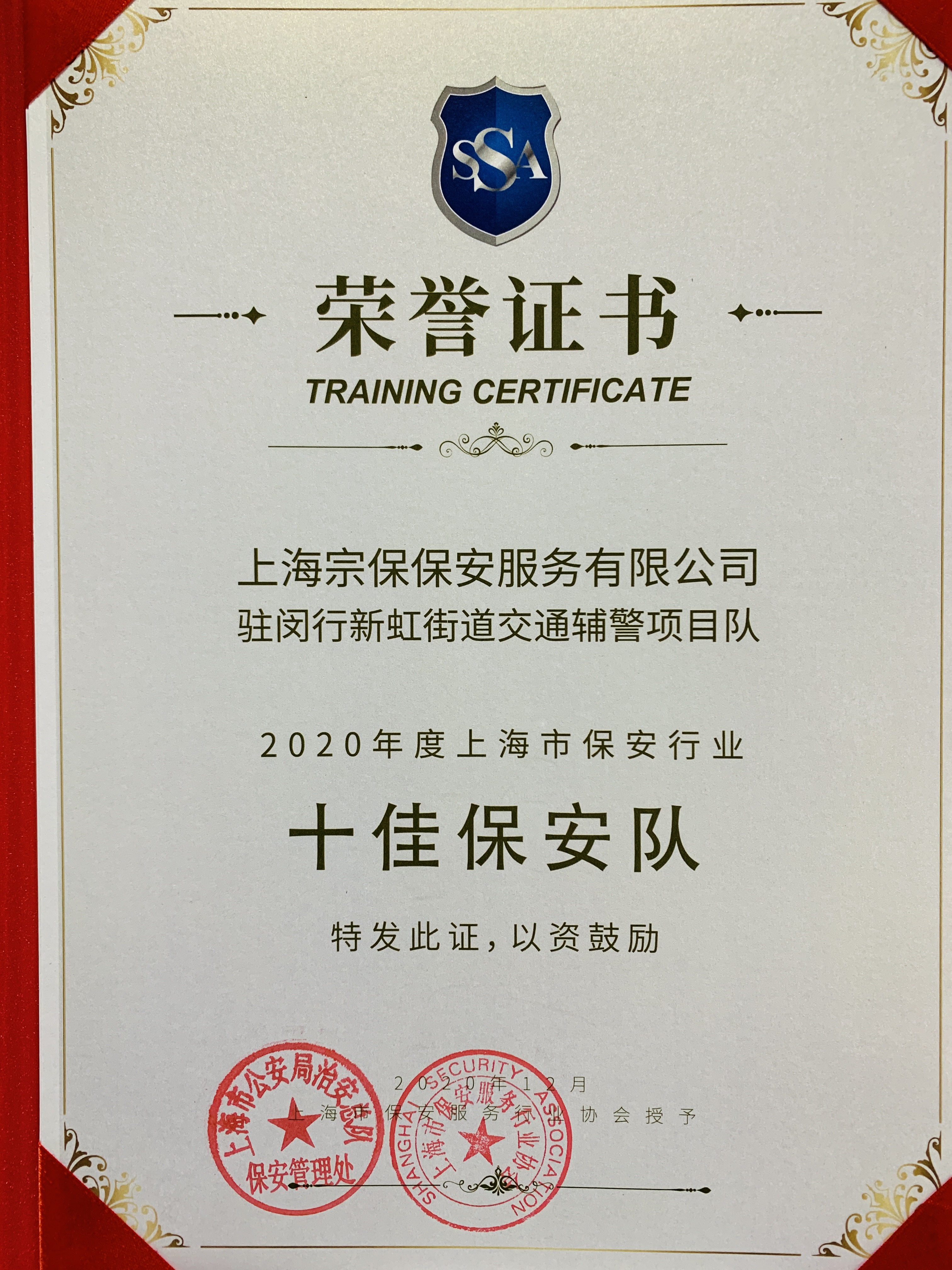 公司駐閔行新虹街道交管輔警項目隊被評為“2020年度上海市保安行業(yè)十佳保安隊”。