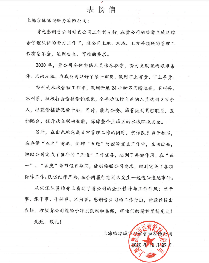 12月30日,宗保公司收到上海臨港城市運(yùn)營(yíng)管理有限公司送來(lái)的一面繡有“守土有責(zé) 環(huán)境衛(wèi)士”的錦旗和一封表?yè)P(yáng)信,信中對(duì)公司隊(duì)員的優(yōu)秀表現(xiàn)提出表?yè)P(yáng)。