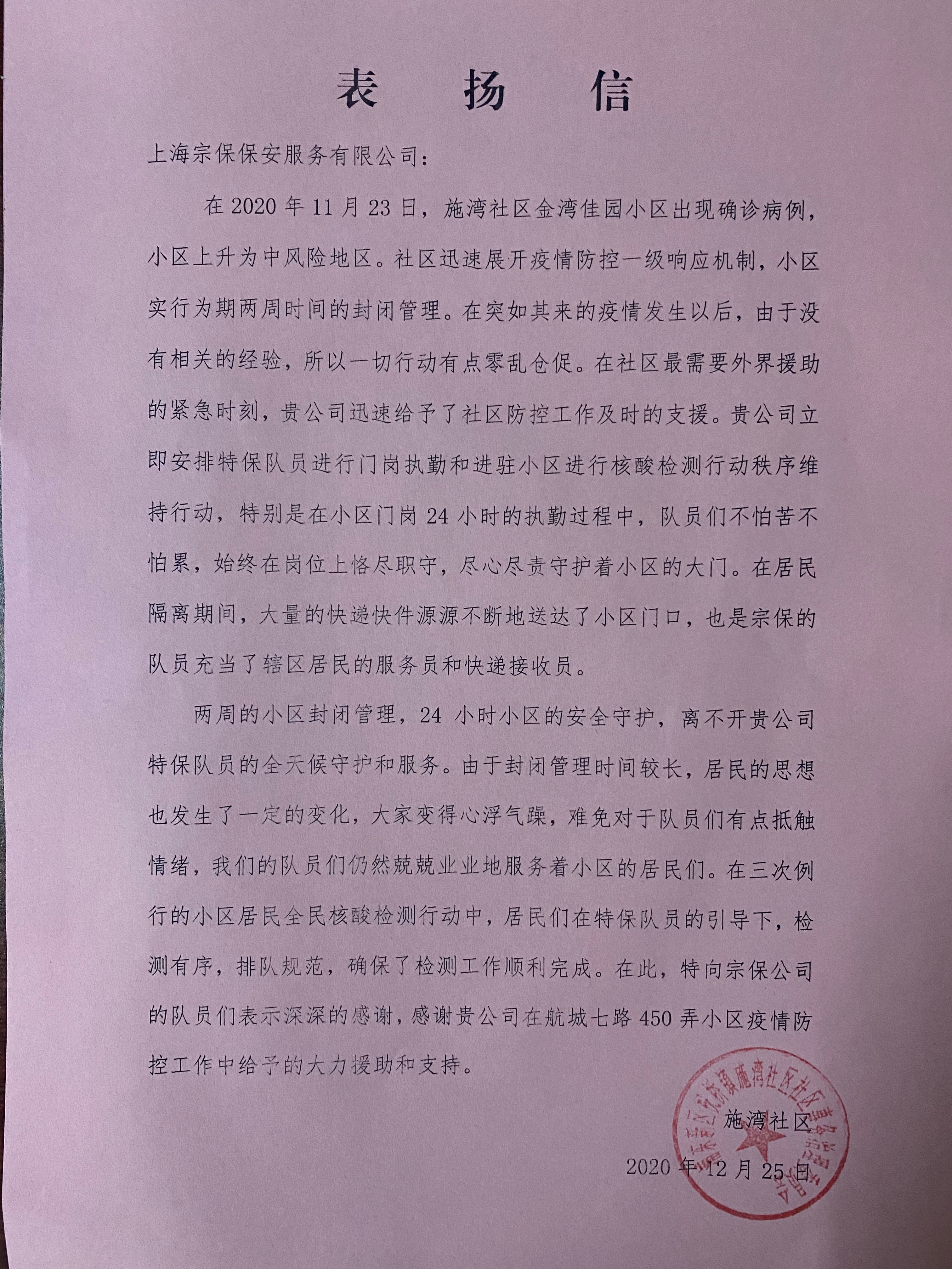 12月25日,宗保公司收到施灣社區(qū)送來的一封表揚(yáng)信,信中對疫情期間宗保公司的大力援助和用心服務(wù)表示感謝。