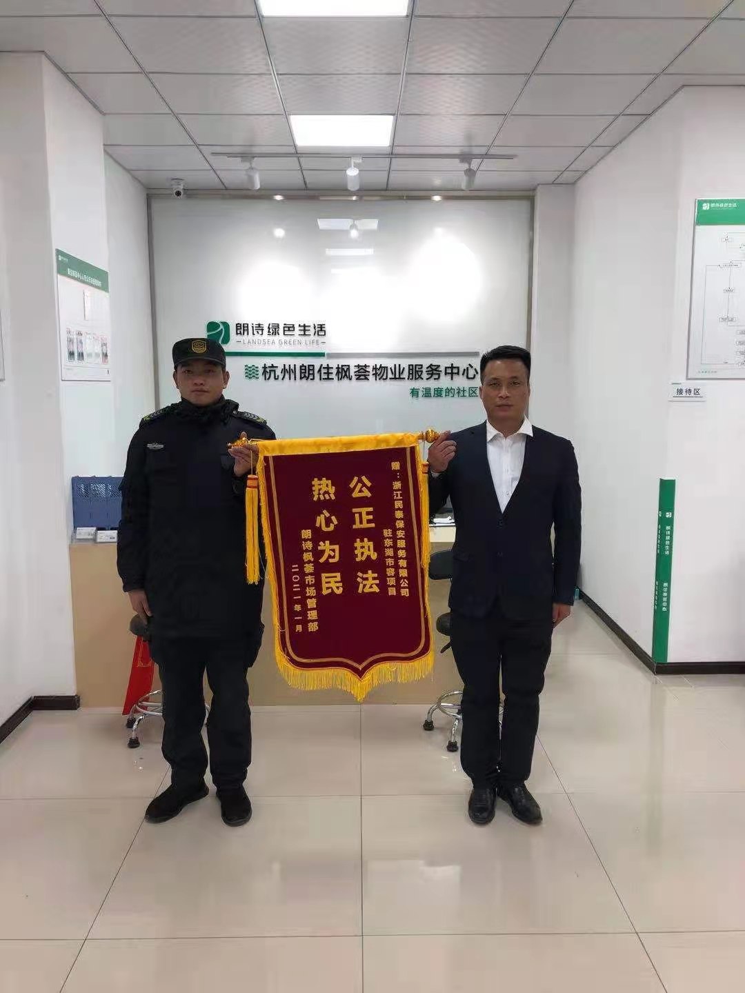 1月10日,民泰公司駐東湖市容項(xiàng)目收到朗詩(shī)楓薈物業(yè)市場(chǎng)管理部送來(lái)的一面繡有“公正執(zhí)法、熱心為民”的錦旗。