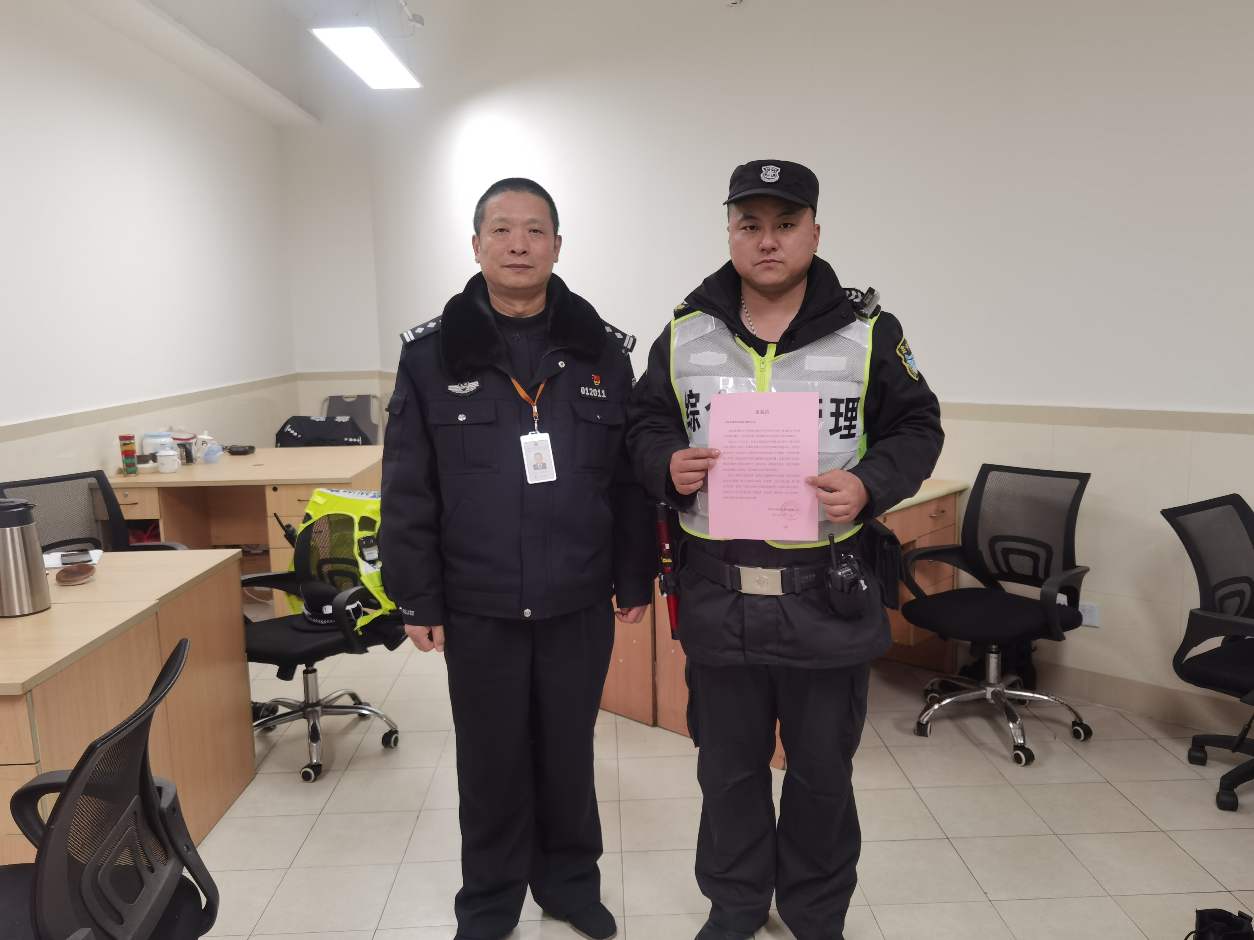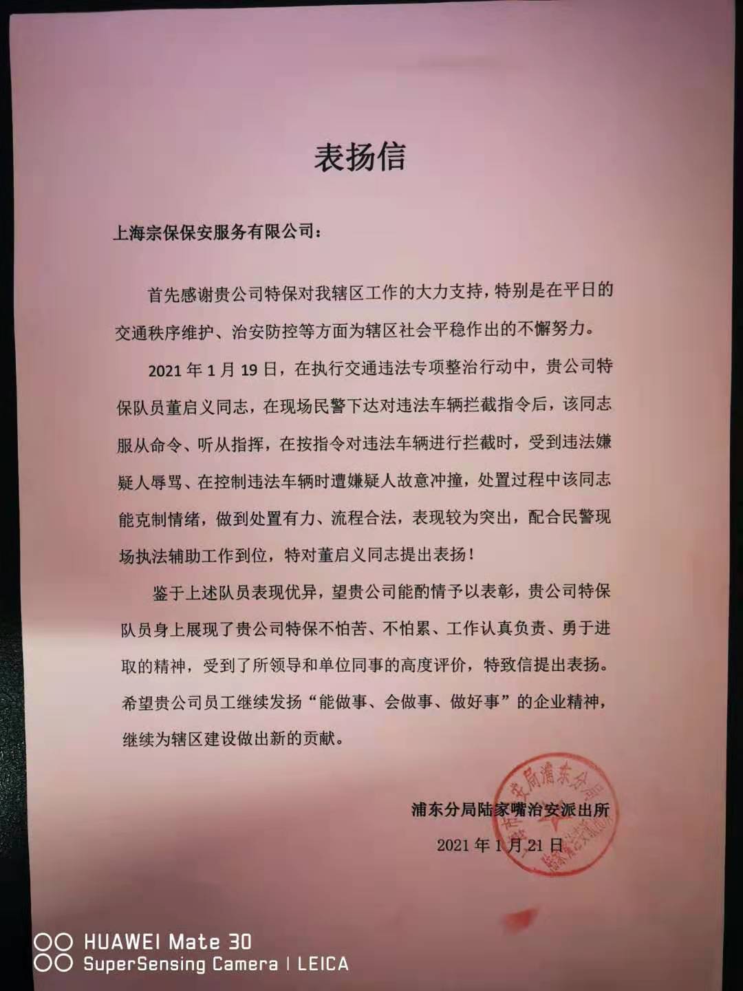 1月21日,宗保公司駐陸家嘴綜合管理項(xiàng)目收到浦東分局陸家嘴治安派出所送來(lái)的一封表?yè)P(yáng)信,信中對(duì)董啟義忍辱克制的優(yōu)秀表現(xiàn)提出表?yè)P(yáng)。