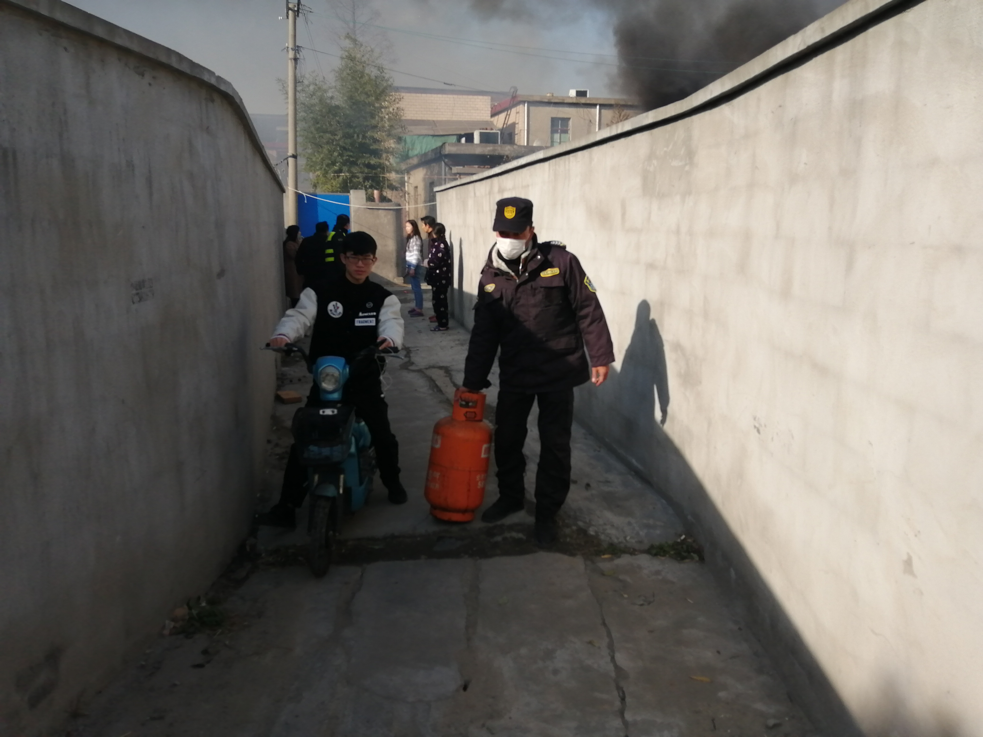 當(dāng)天12:40,王如龍、王金齊、李旭龍三人巡邏至浦東北路與草高支路路口時(shí),發(fā)現(xiàn)附近地塊里有濃煙冒起,便趕緊將電瓶車停好,上前查看。原來是有人點(diǎn)火燒干草,但由于當(dāng)時(shí)風(fēng)大,把周圍的干草引燃了,火勢很快蔓延到了附近居民區(qū)。
