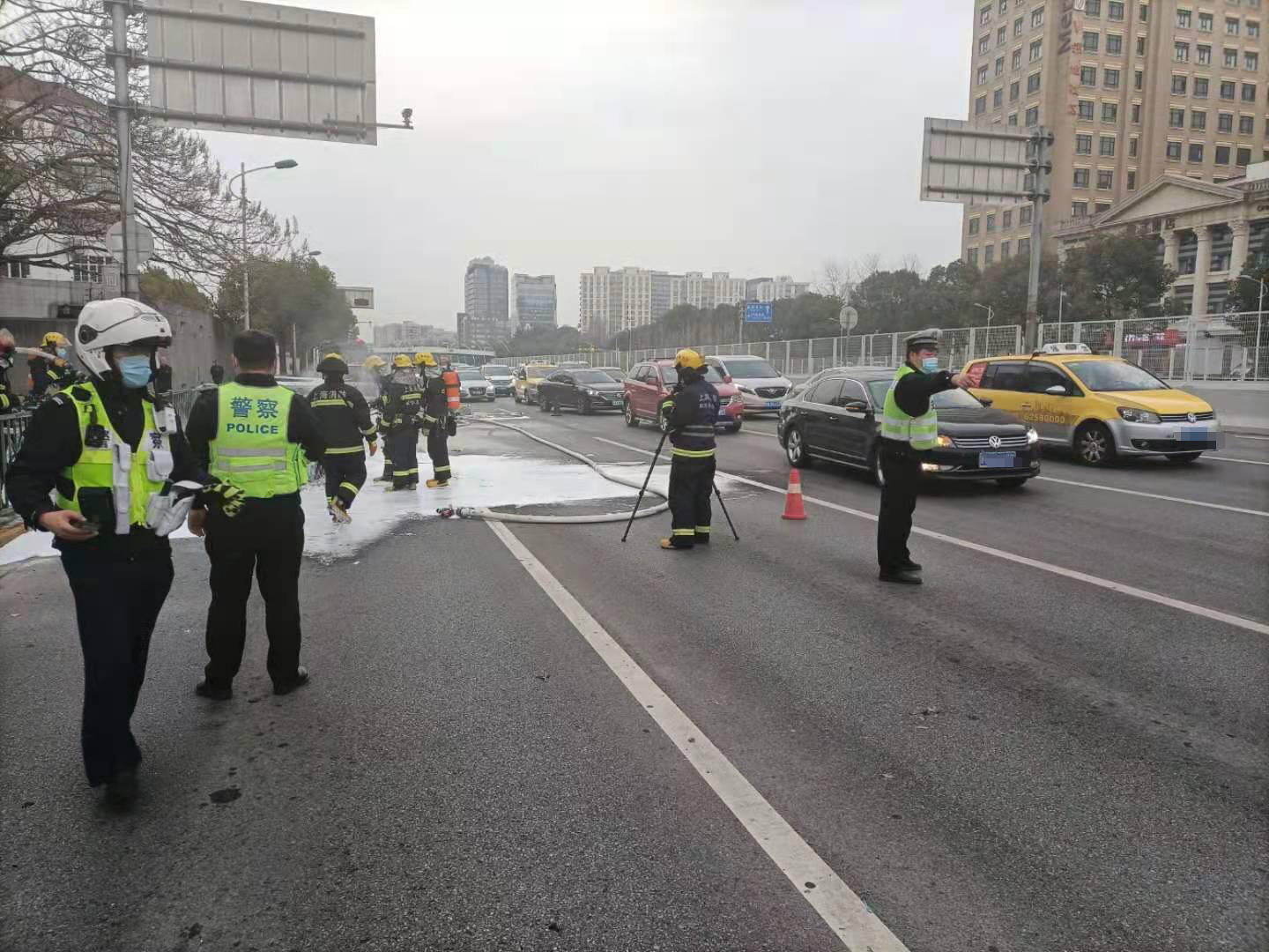 隨即趕到現(xiàn)場(chǎng)的隊(duì)員,配合消防和民警,對(duì)現(xiàn)場(chǎng)進(jìn)行緊急疏散,引導(dǎo)過(guò)往車輛分流繞行,經(jīng)過(guò)近半個(gè)小時(shí)的奮戰(zhàn)終于將火撲滅。