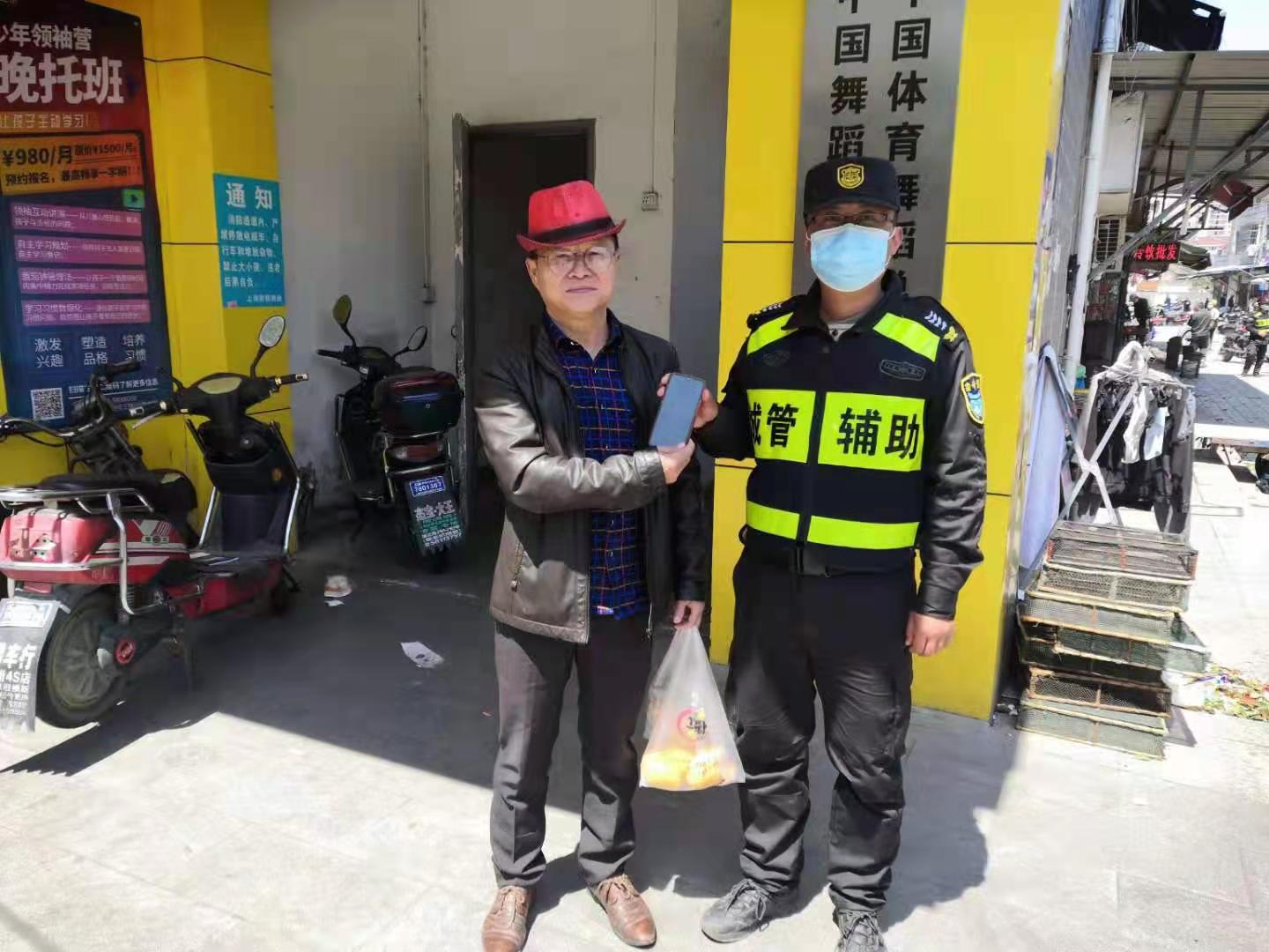 當(dāng)日11:30左右,趙春雷在東南萊市場(chǎng)弄堂口巡邏時(shí),撿到一部手機(jī),便立刻上報(bào)當(dāng)班組長(zhǎng),并于隨后趕到現(xiàn)場(chǎng)的當(dāng)班組長(zhǎng)一起留在原地等待失主。