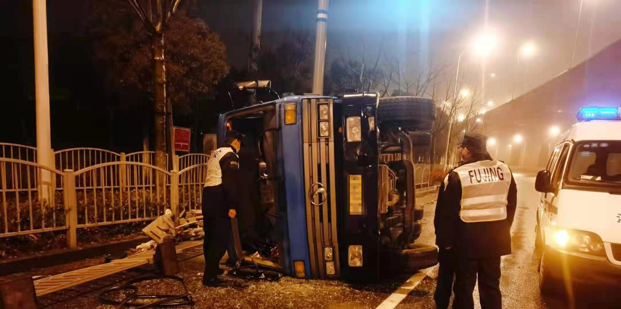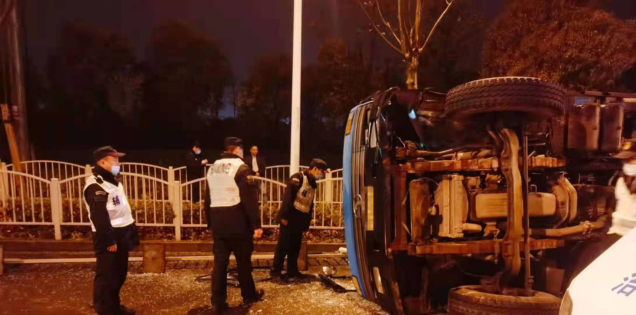 當(dāng)天凌晨1:00左右,金橋派出所值班室接到路人報(bào)警,稱在申江路云順路有一輛拉滿渣土的貨車(chē)因?yàn)橛晏炻坊?chē)速過(guò)快發(fā)生了側(cè)翻。