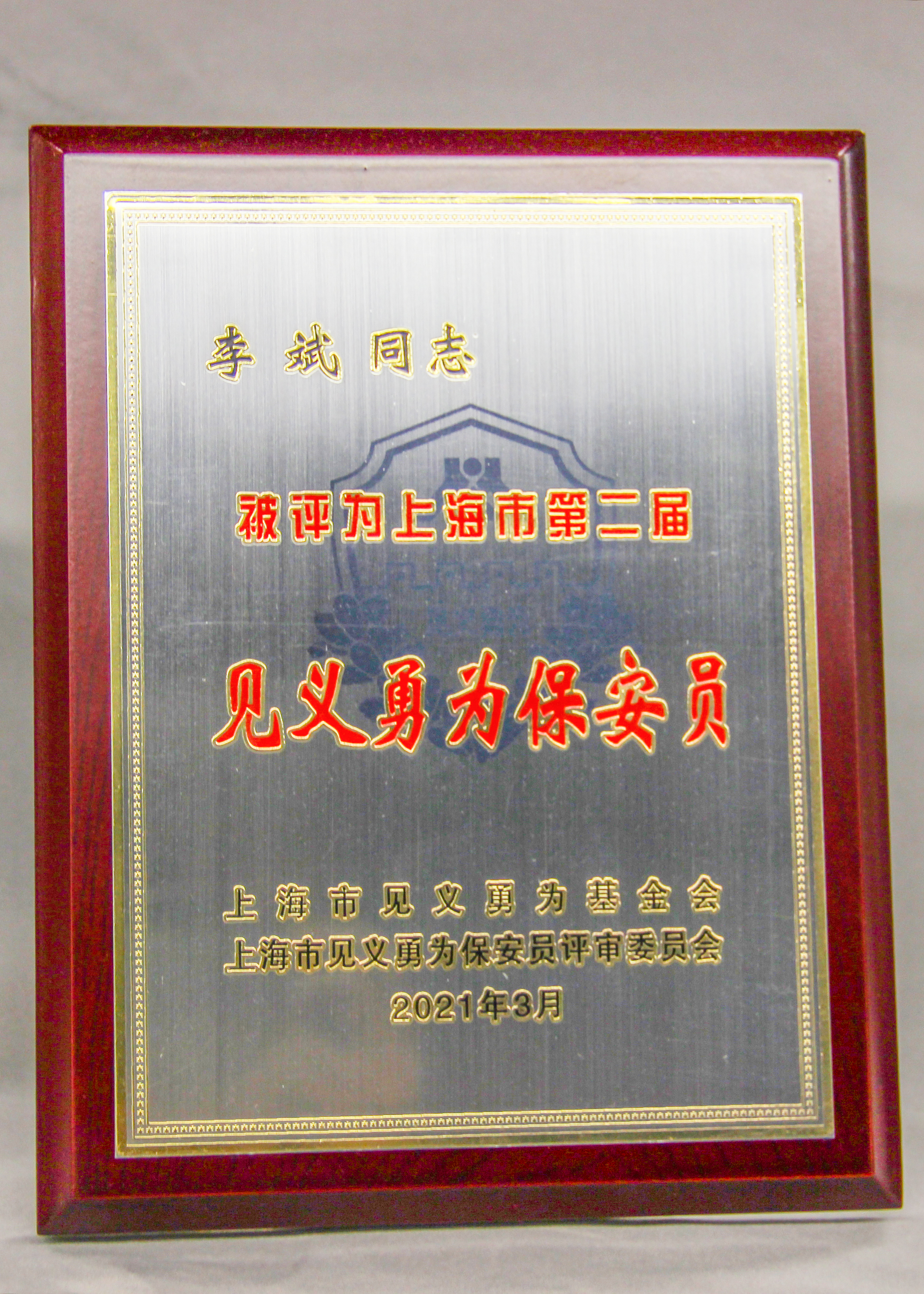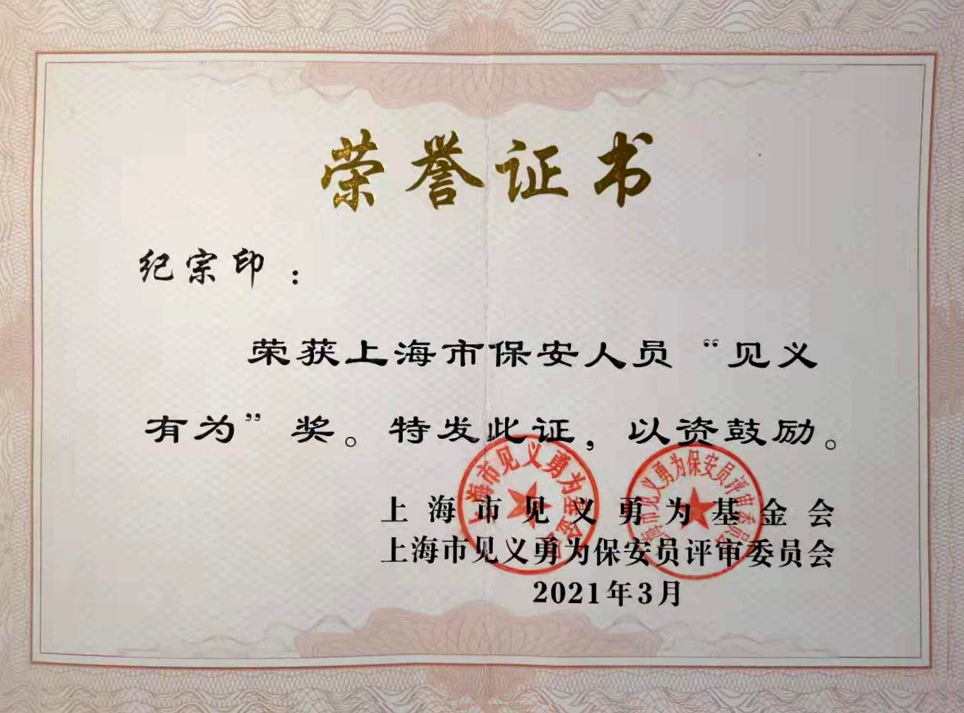 宗保公司譚波、李斌被授予“上海市見義勇為保安員”稱號(hào),紀(jì)宗印榮獲上海市保安人員“見義有為”獎(jiǎng)。