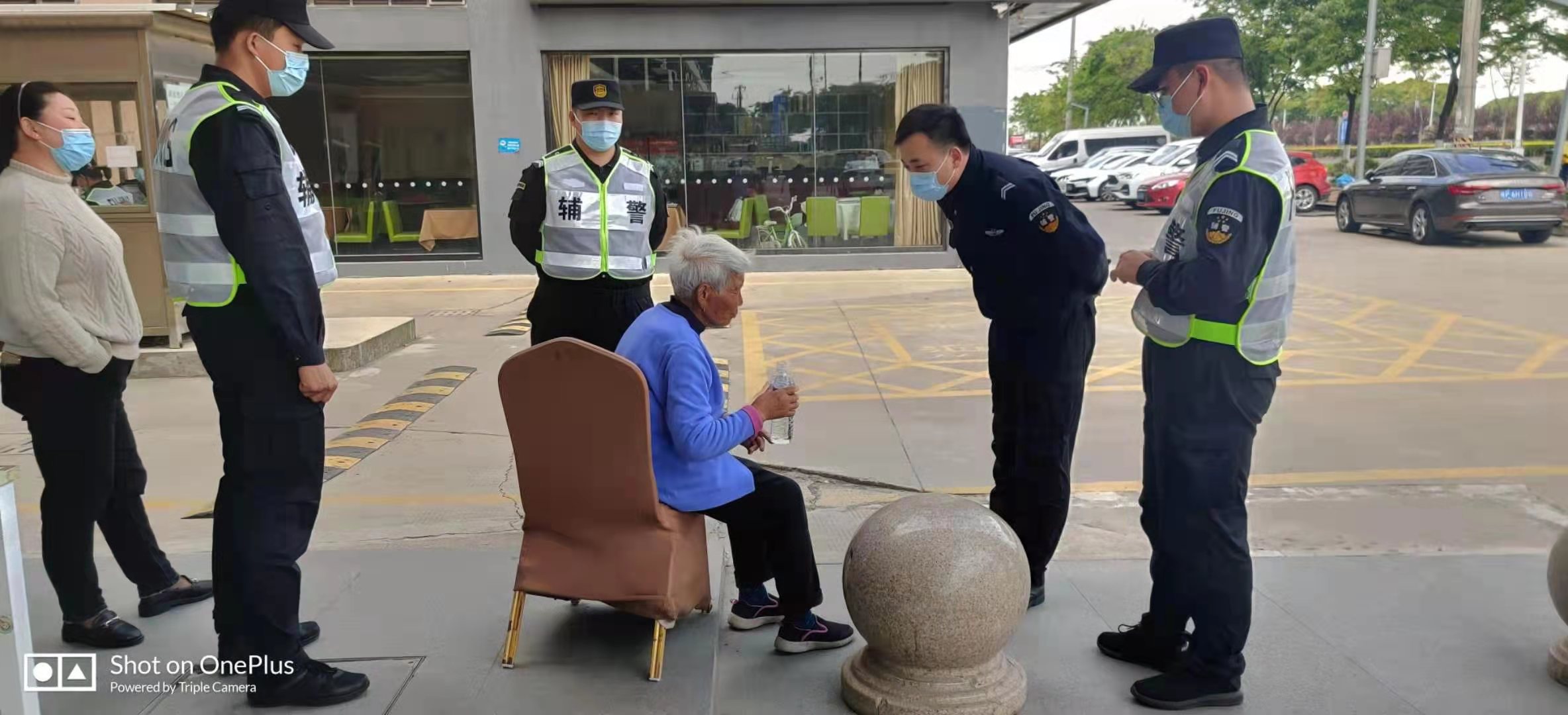 當天12:30左右,隊員王震發(fā)現(xiàn)一位約八旬的老人在項目駐地門口來回徘徊,便上前詢問。因老人說方言,王震只大致聽懂老人是山西人,迷路找不到家了。見老人嘴唇干裂,年紀大身體虛弱,站立不穩(wěn),隊員唐振強趕緊扶住老人。同事高超趕緊搬來凳子,讓老人坐下休息,李文廣貼心地給老人端水。