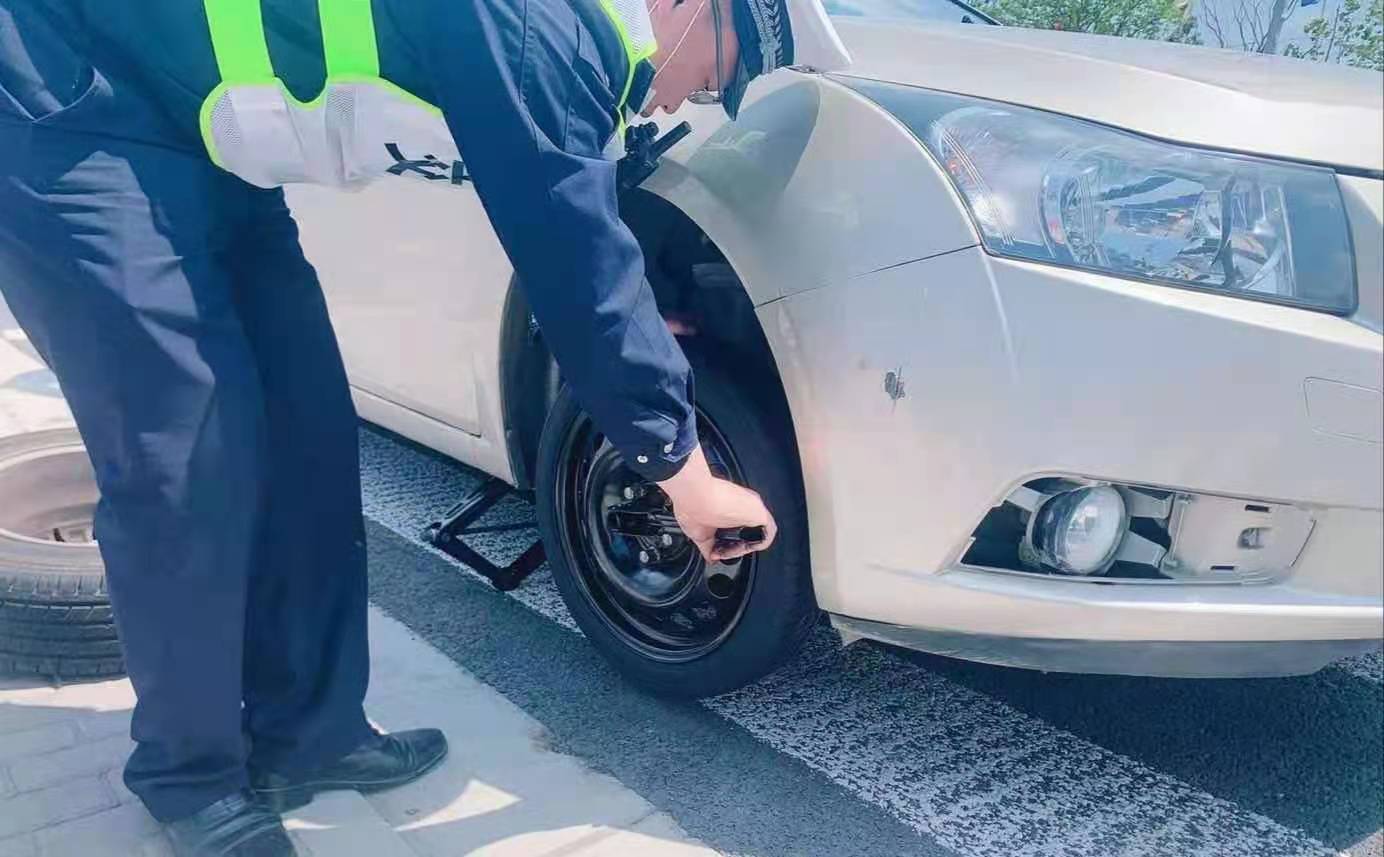 當(dāng)日10:15,一位女士駕駛汽車行駛至動物園2號門時,車輛右前輪突然爆胎,打著雙閃燈停在斑馬線上,路口當(dāng)值交管輔警王志文和候歡發(fā)現(xiàn)后,立即上前詢問。