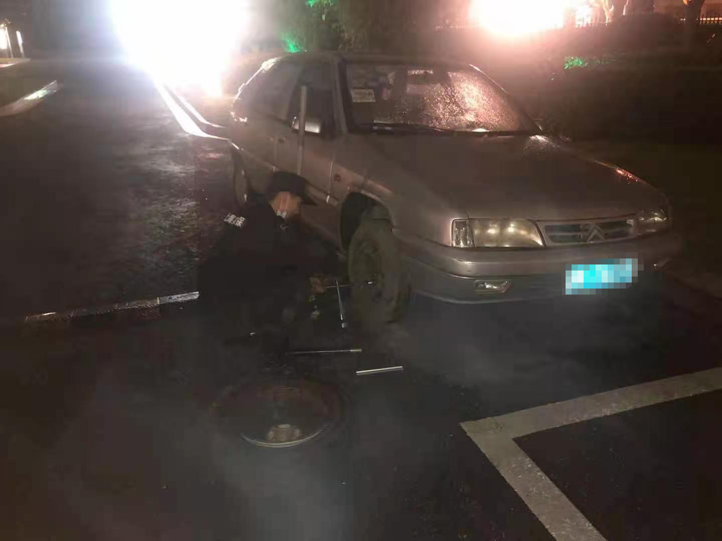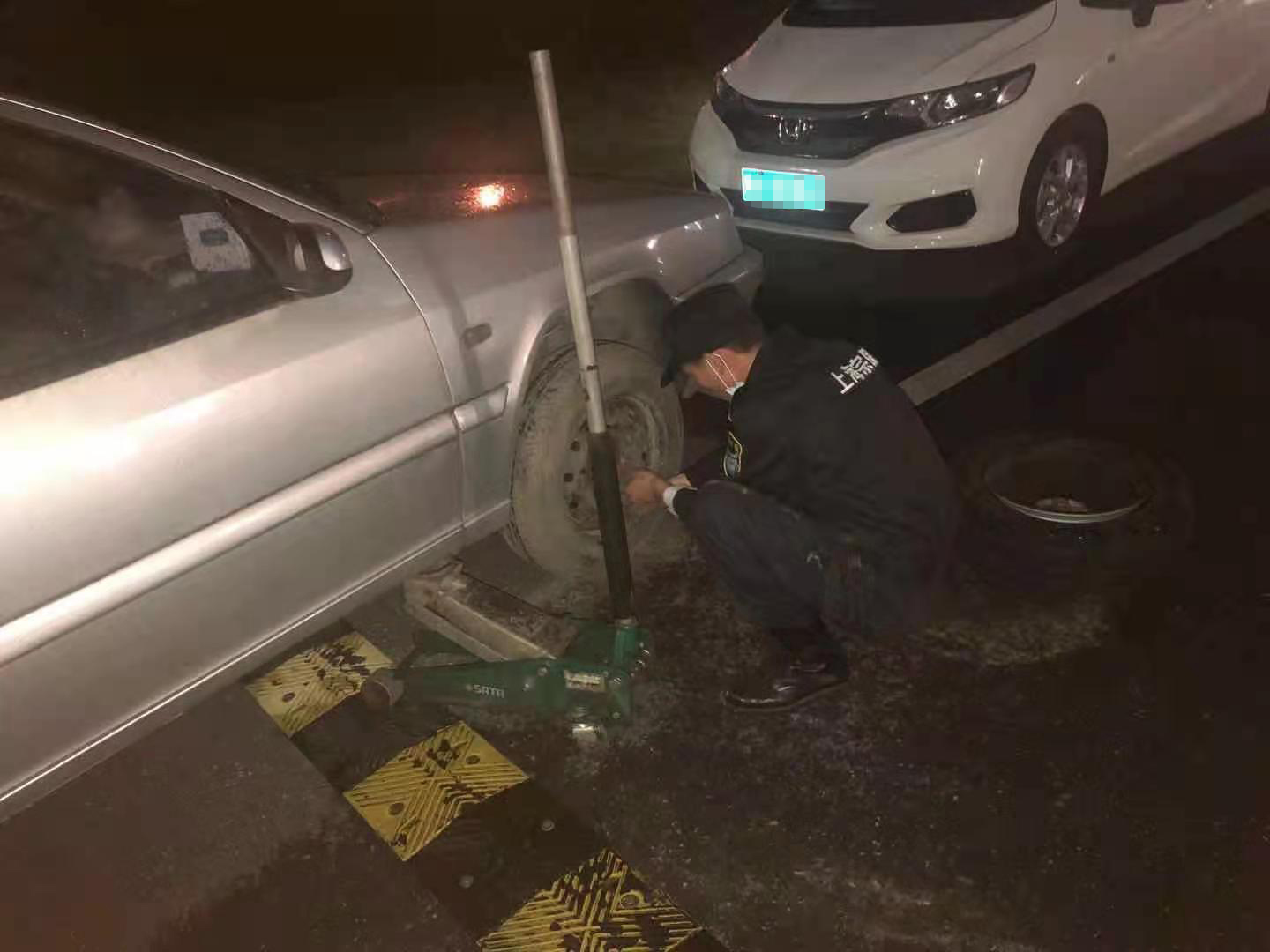 4月26日,宗保公司駐惠南野生動物園交管項(xiàng)目隊(duì)員幫助一女士更換輪胎。