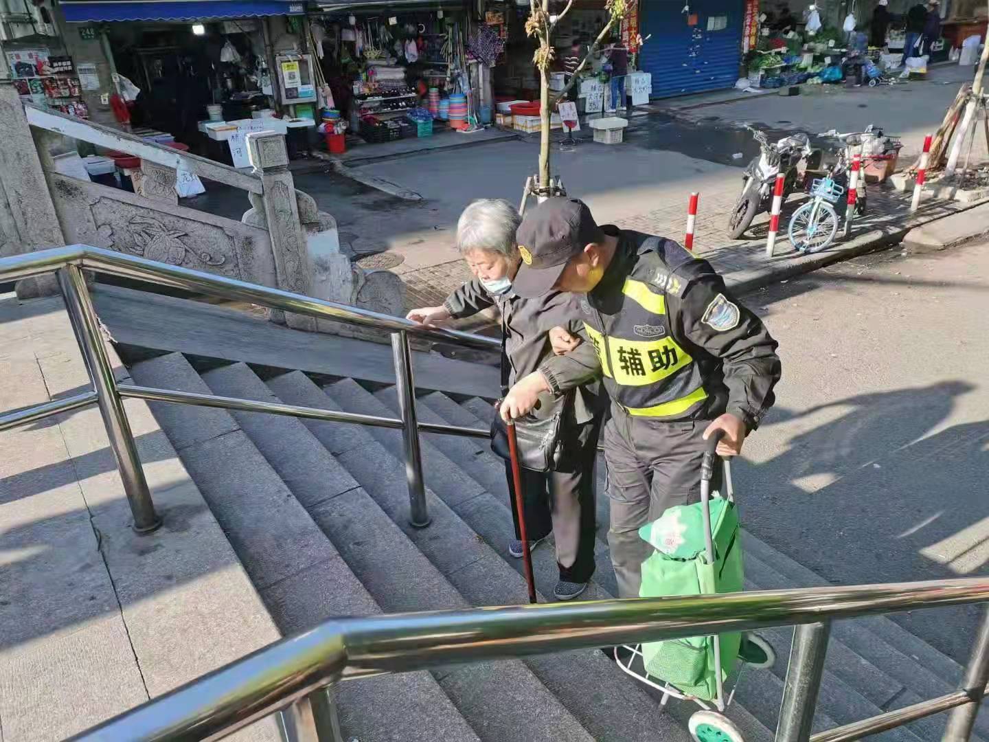 當(dāng)日7:00左右,鄭健在湯家木橋巡邏時,看到一位老奶奶,正推著裝滿物品的購物車,行動不便,在天橋上艱難地行走著。