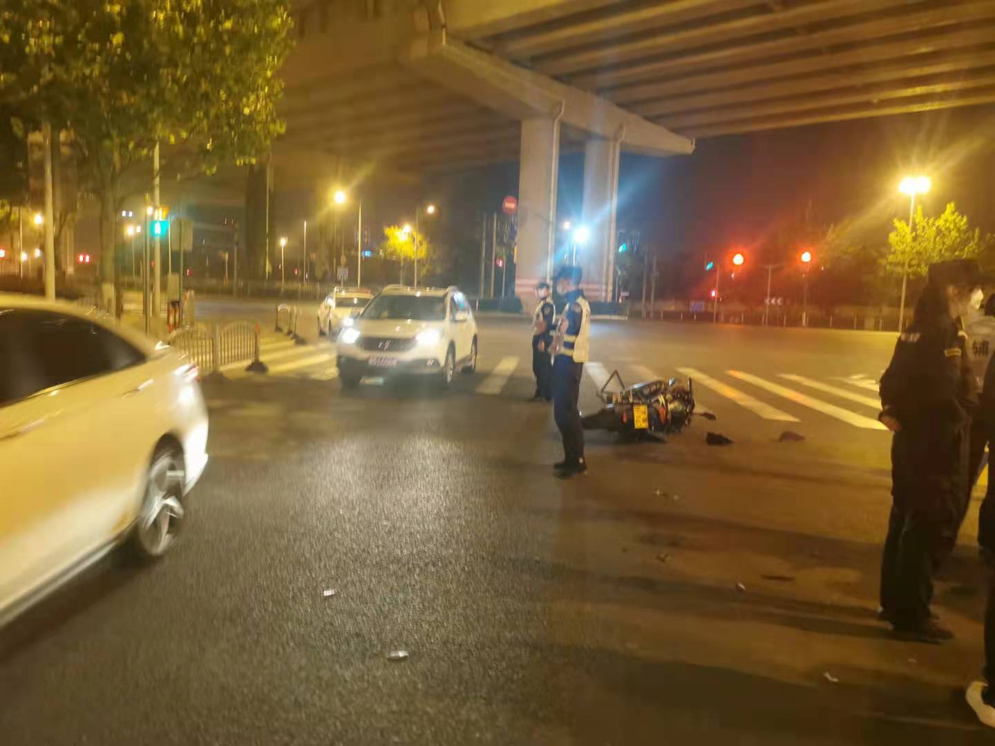 當(dāng)天23:30,駐金橋派出所夜班巡邏隊(duì)員張港、賴作利巡邏至錦繡東路近金橋路時(shí),發(fā)現(xiàn)前方路口發(fā)生交通事故,便立即上前查看,一摩托車駕駛員由于拐彎速度過快與對向正在行駛的一輛轎車相撞。