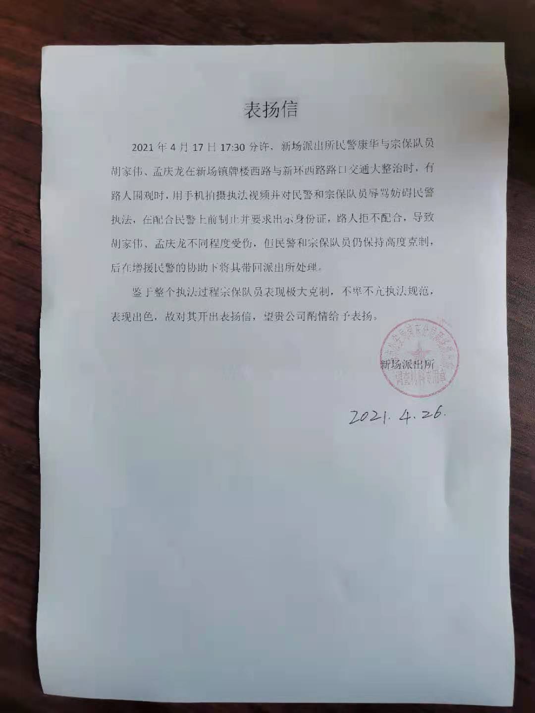 4月26號,宗保公司駐新場輔警項(xiàng)目收到新場派出所送來的表揚(yáng)信,信中對胡家偉、孟慶龍忍辱克制的優(yōu)秀表現(xiàn)提出表揚(yáng)。