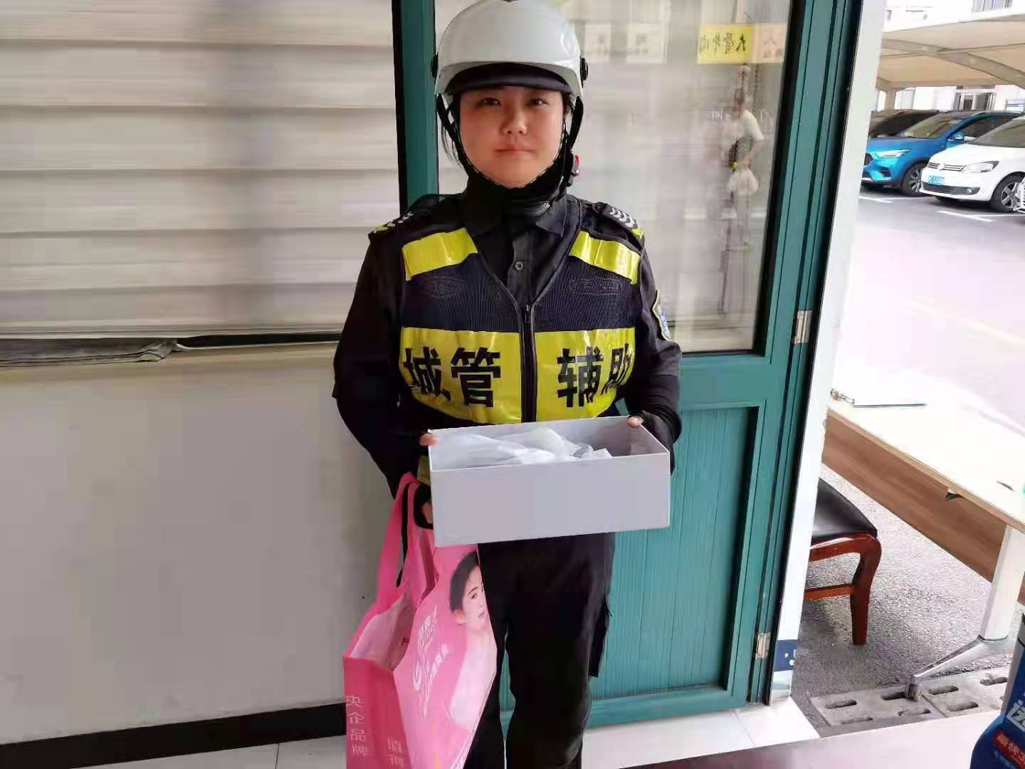 當(dāng)天15:30,曹秋霞巡邏至小上海步行街時(shí),在路邊撿到一個(gè)手提袋,袋內(nèi)有一雙嶄新的女士皮鞋和兩盒禮品??紤]到失主可能會(huì)回來(lái)尋找,便在原地等候。半個(gè)小時(shí)后,仍然沒(méi)有人前來(lái)尋找,曹秋霞便將手提袋送交到周浦城管中隊(duì)窗口,然后回到崗位繼續(xù)巡邏。