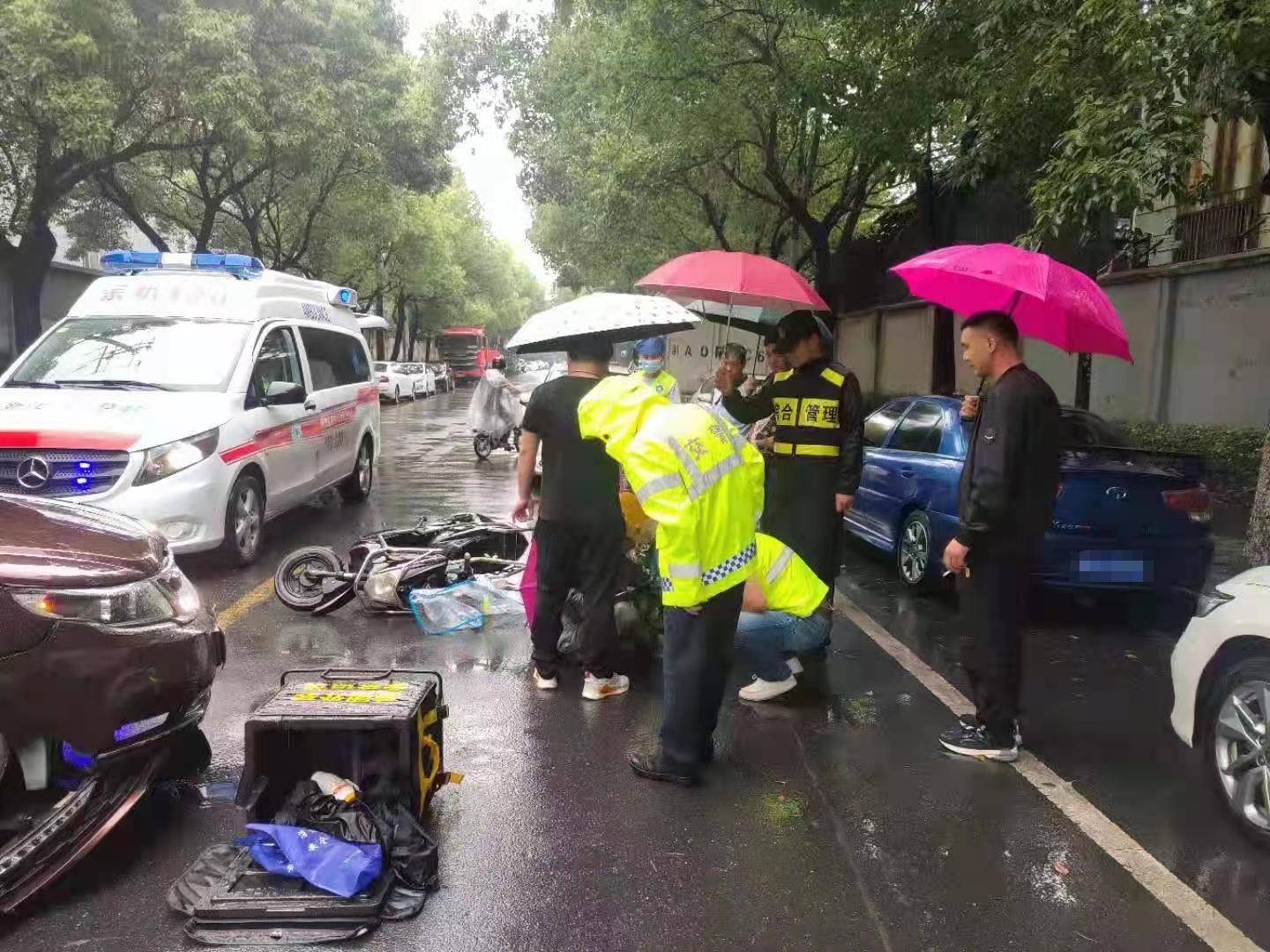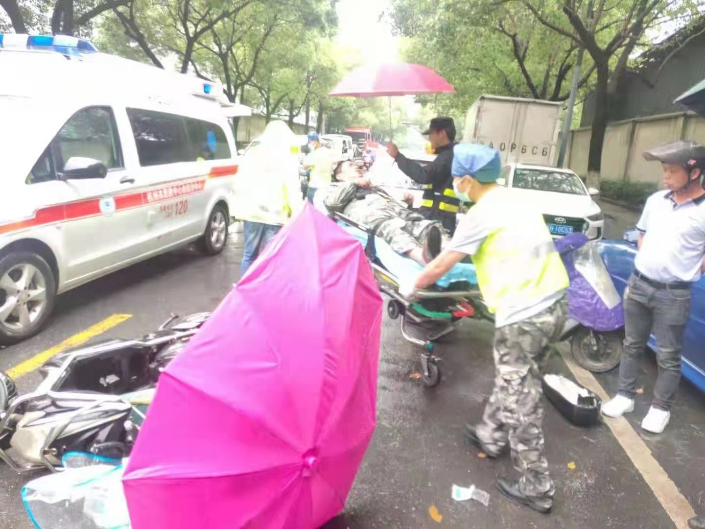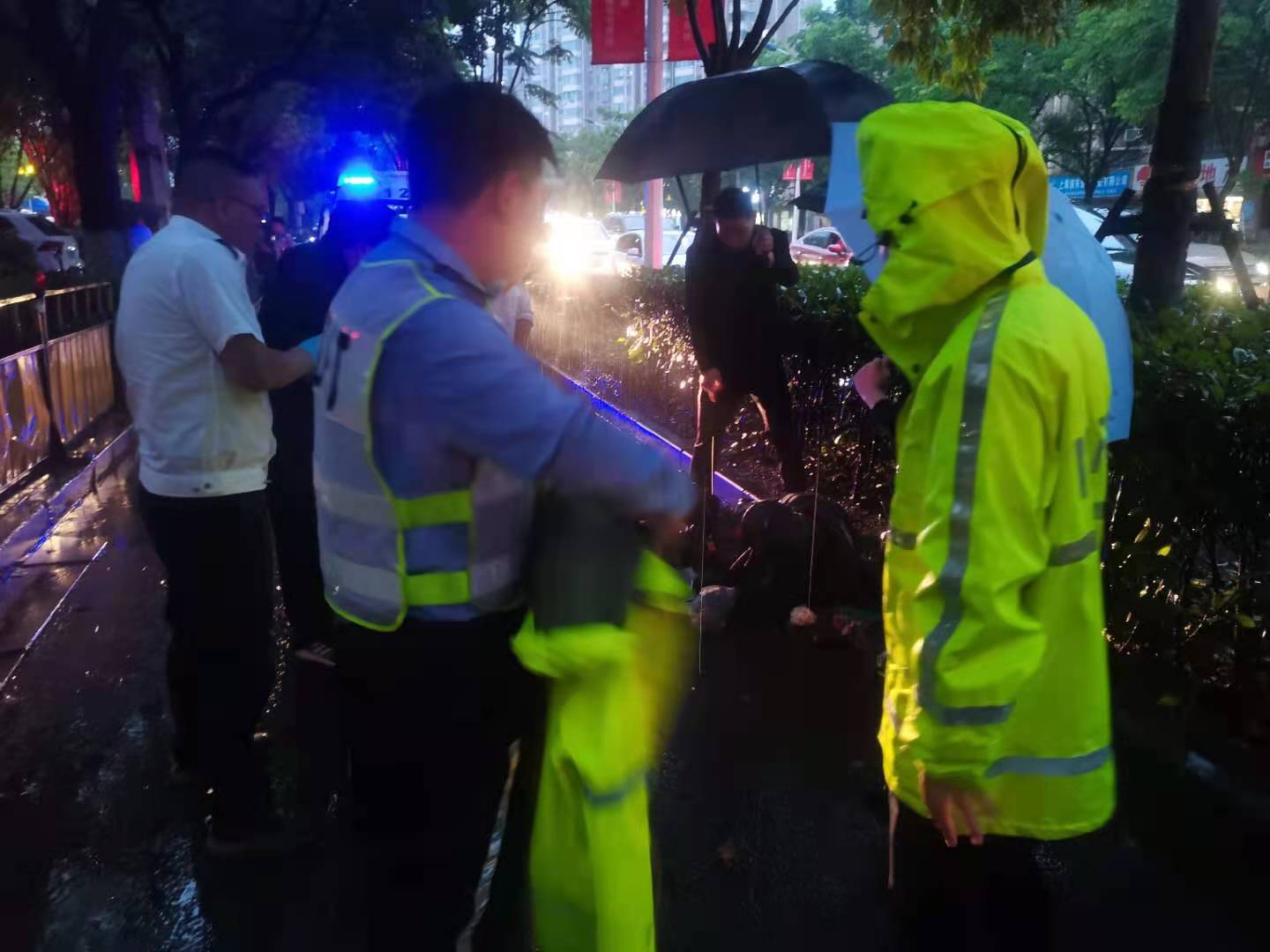 當(dāng)時(shí)天正下著大雨,因擔(dān)心長(zhǎng)時(shí)間淋雨受傷男子會(huì)感冒,細(xì)心的孫義強(qiáng)跑到附近商鋪,借來(lái)雨傘為等待救護(hù)的男子撐傘避雨。同時(shí),為防止二次交通事故傷害,王衛(wèi)強(qiáng)在現(xiàn)場(chǎng)進(jìn)行交通疏導(dǎo)。