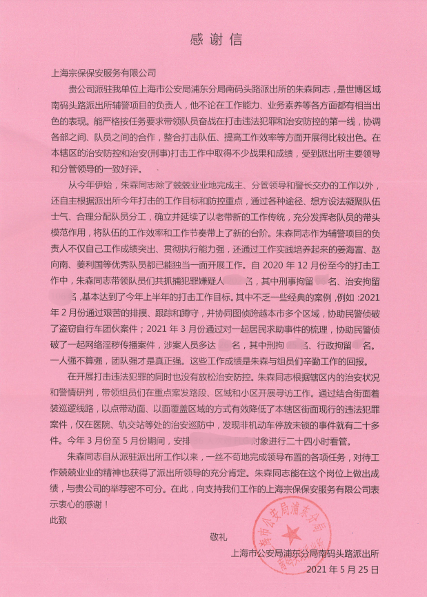 5月25日,宗保公司駐南碼頭路派出所輔警項(xiàng)目收到南碼頭路派出所送來(lái)的一封感謝信,信中稱贊項(xiàng)目負(fù)責(zé)人朱森認(rèn)真負(fù)責(zé)的工作態(tài)度和兢兢業(yè)業(yè)的工作精神。
