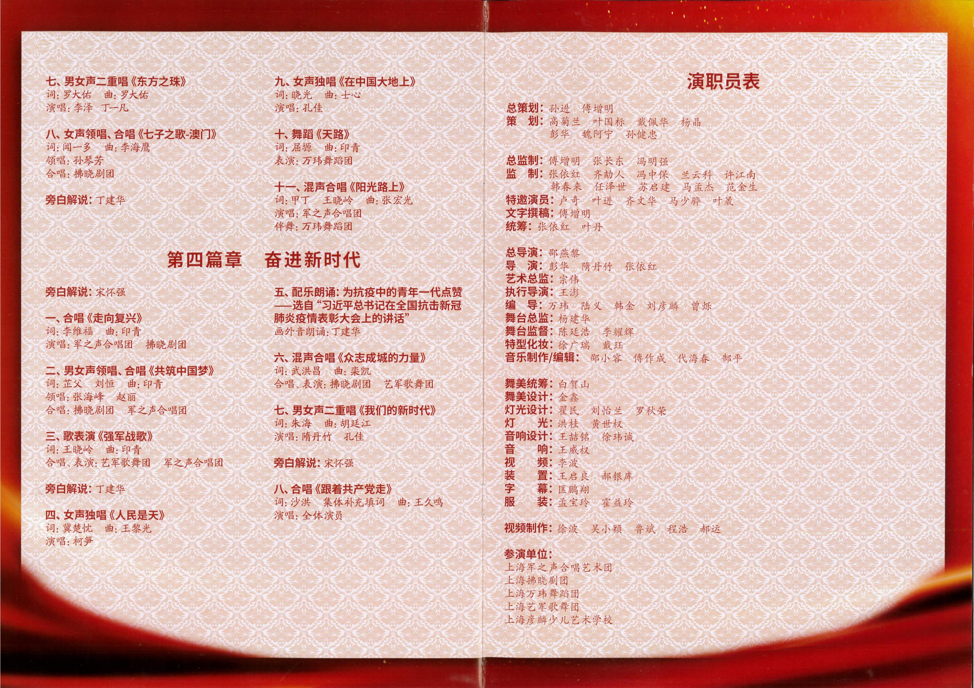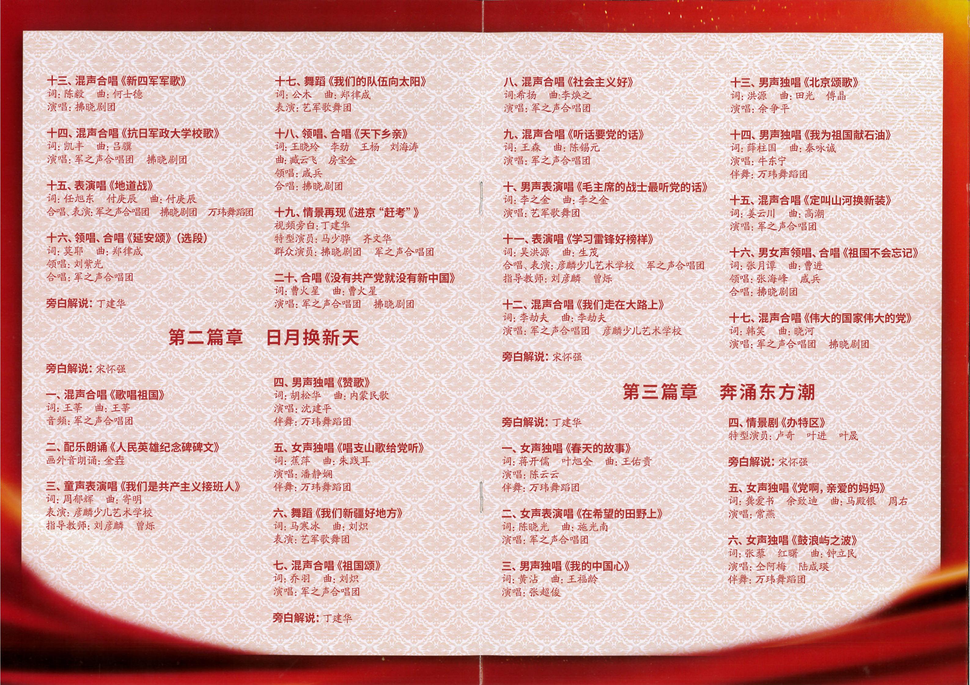 演出從6月8日開始至6月10日結(jié)束,包含四個(gè)篇章:“崢嶸歲月稠”“日月?lián)Q新天”“奔涌東方潮”“奮進(jìn)新時(shí)代”,分別反映了黨在新民主主義革命、社會主義革命和建設(shè)時(shí)期,改革開放和中國特色社會主義進(jìn)入新時(shí)代這四個(gè)階段,團(tuán)結(jié)帶領(lǐng)中國人民不斷從勝利走向勝利的光輝歷程。