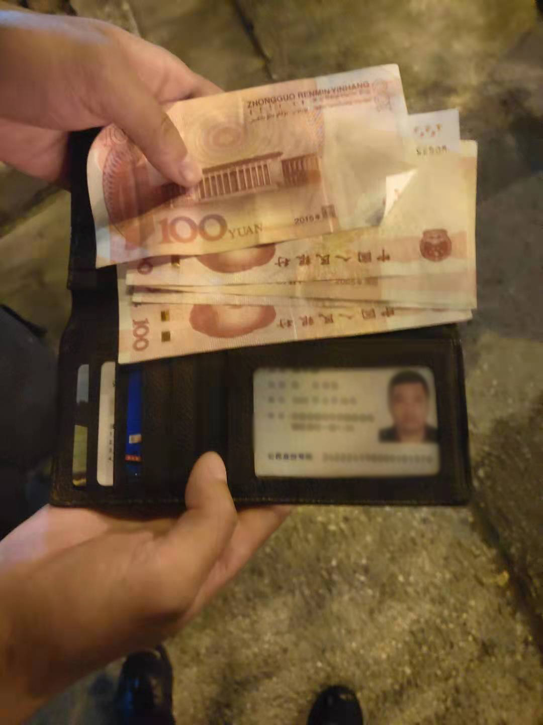 當(dāng)日20:15,王磊在周祝公路康新公路路口巡邏時(shí),撿到一個(gè)黑色錢包,內(nèi)有現(xiàn)金500元、一張身份證、兩張加油卡和一張銀行卡,便當(dāng)即將情況上報(bào)項(xiàng)目負(fù)責(zé)人,并按指示在原地等待。