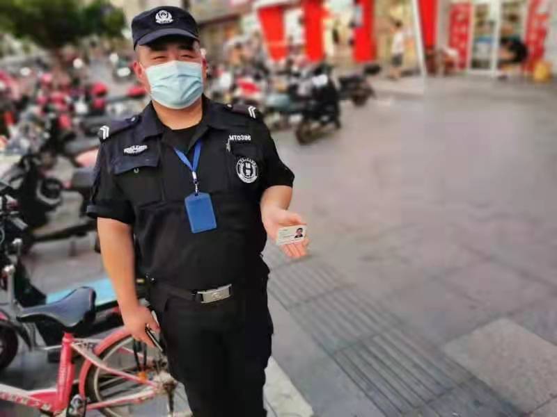 當(dāng)日,薛俊龍?jiān)谔K杭情超市門口巡邏執(zhí)勤時(shí),撿到一張身份證,便立即上報(bào)當(dāng)班組長(zhǎng),并按指令在原地等待。