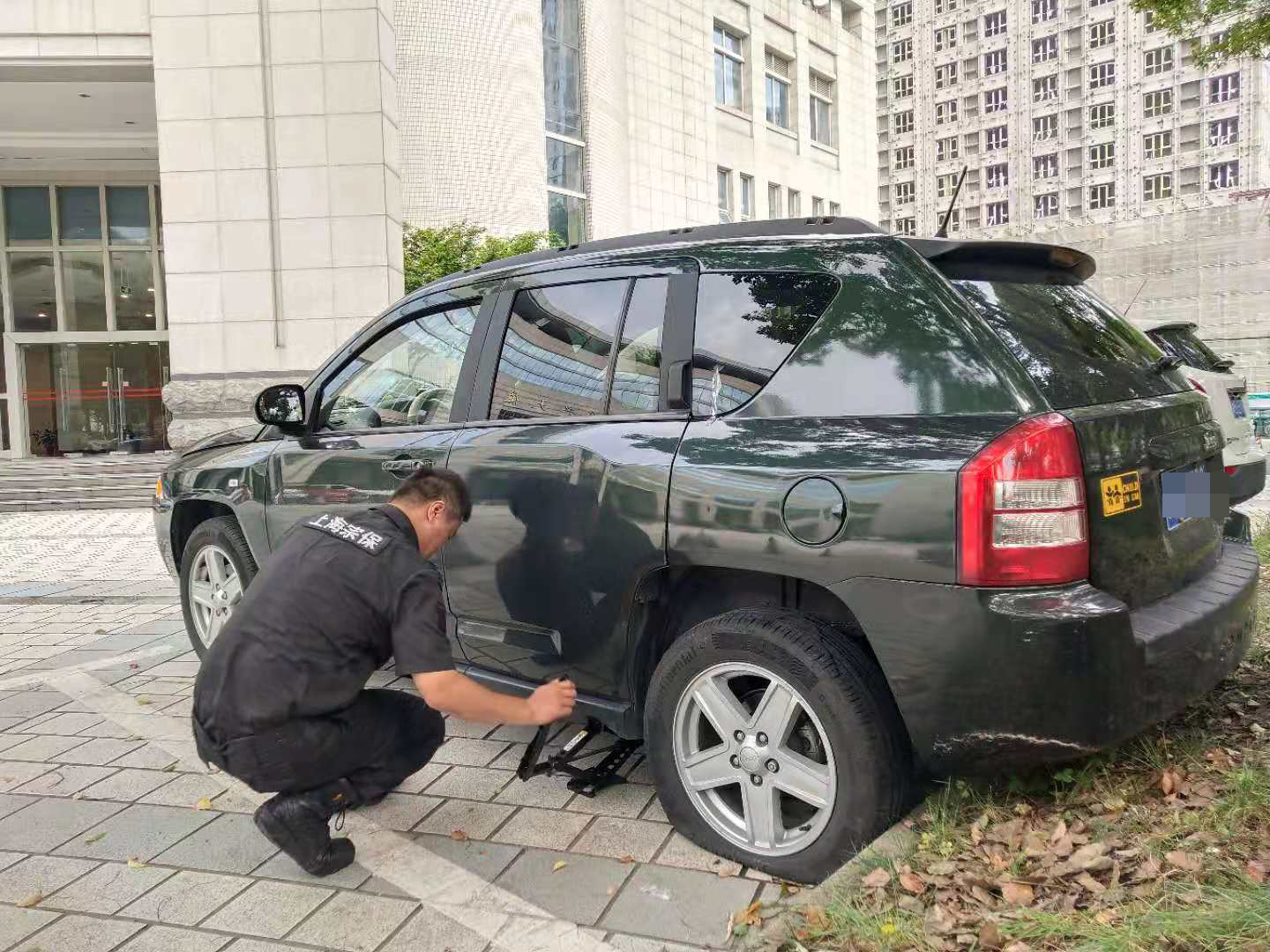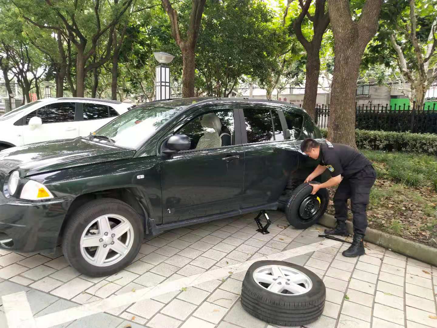 當(dāng)天7:00,項(xiàng)目組長(zhǎng)許志剛在校內(nèi)巡邏時(shí),發(fā)現(xiàn)北門(mén)停車(chē)場(chǎng)有位男子一直在徘徊,便立即上前詢(xún)問(wèn)。原來(lái)這位男子是來(lái)黨校參加“哲社班”培訓(xùn)的學(xué)員,車(chē)子后輪被釘子扎破,完全沒(méi)氣無(wú)法行走,一時(shí)找不到維修師傅,心理十分著急。