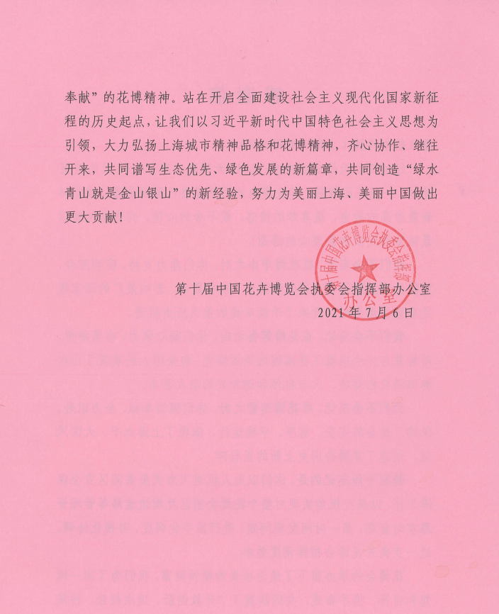 7月6日,鷹飛航空科技(上海)有限公司收到第十屆中國花卉博覽會執(zhí)委會指揮部送來的感謝信,信中對鷹飛公司花博會期間全力以赴助力保障展會安全有序平穩(wěn)運行表示感謝。