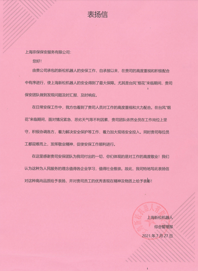 公司駐新松機(jī)器人安保項(xiàng)目受到甲方表?yè)P(yáng),得益于甲方的信任和支持,更離不開宗保隊(duì)員們的辛勞和付出。全體宗保人將珍惜榮譽(yù)、再接再厲,努力完成好甲方賦予的每項(xiàng)工作任務(wù)。
