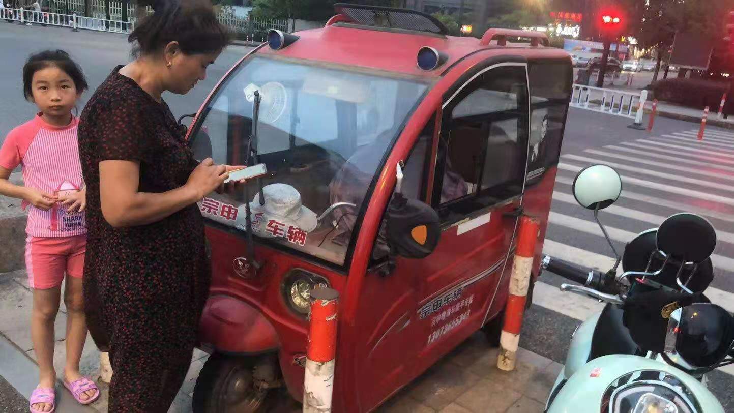 原來,三輪車車輪卡在了馬路牙子上無法行走,電動(dòng)車上還帶著孩子,阿姨干著急,不知道該怎么辦。劉明念一邊安慰阿姨,一邊幫助阿姨讓小孩從車上下來。