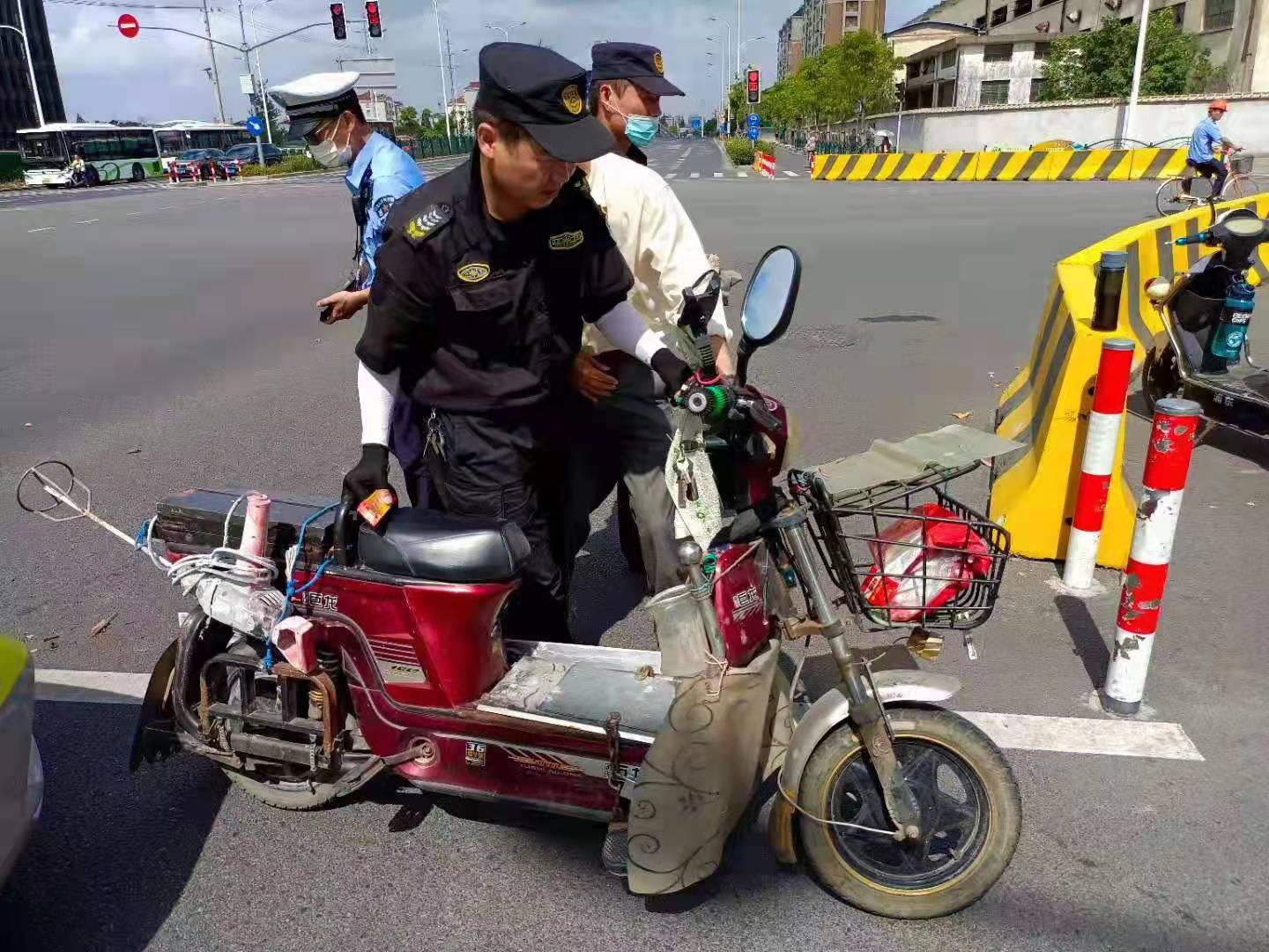 當(dāng)天18:40,隊(duì)員劉明念在東湖街道北沙西路156號(hào)金都夏宮附近巡邏時(shí),看到一位阿姨騎著電動(dòng)三輪車緊貼馬路牙子,一直在加速,但電動(dòng)三輪車就是不動(dòng)??吹竭@一幕的劉明念,趕緊上前詢問。