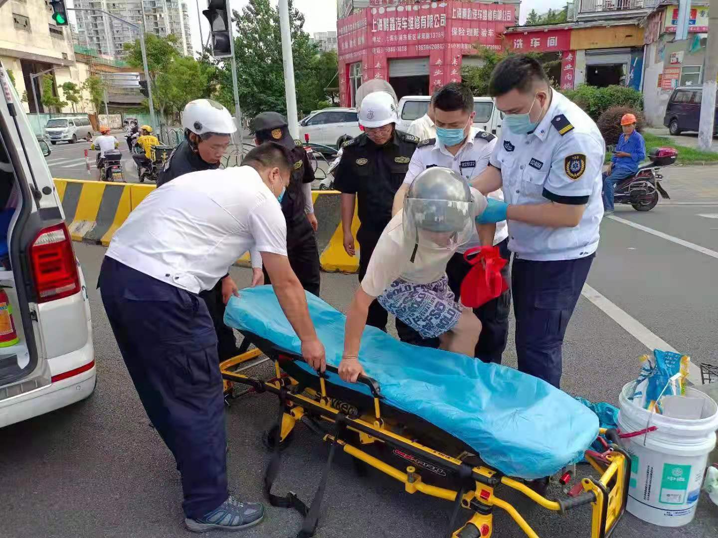 很快,救護(hù)車、交警和男子家人趕到現(xiàn)場,兩名隊(duì)員協(xié)助醫(yī)護(hù)人員將男子抬上救護(hù)車,受傷男子家人對兩名隊(duì)員熱心助人的行為再三表示感謝。