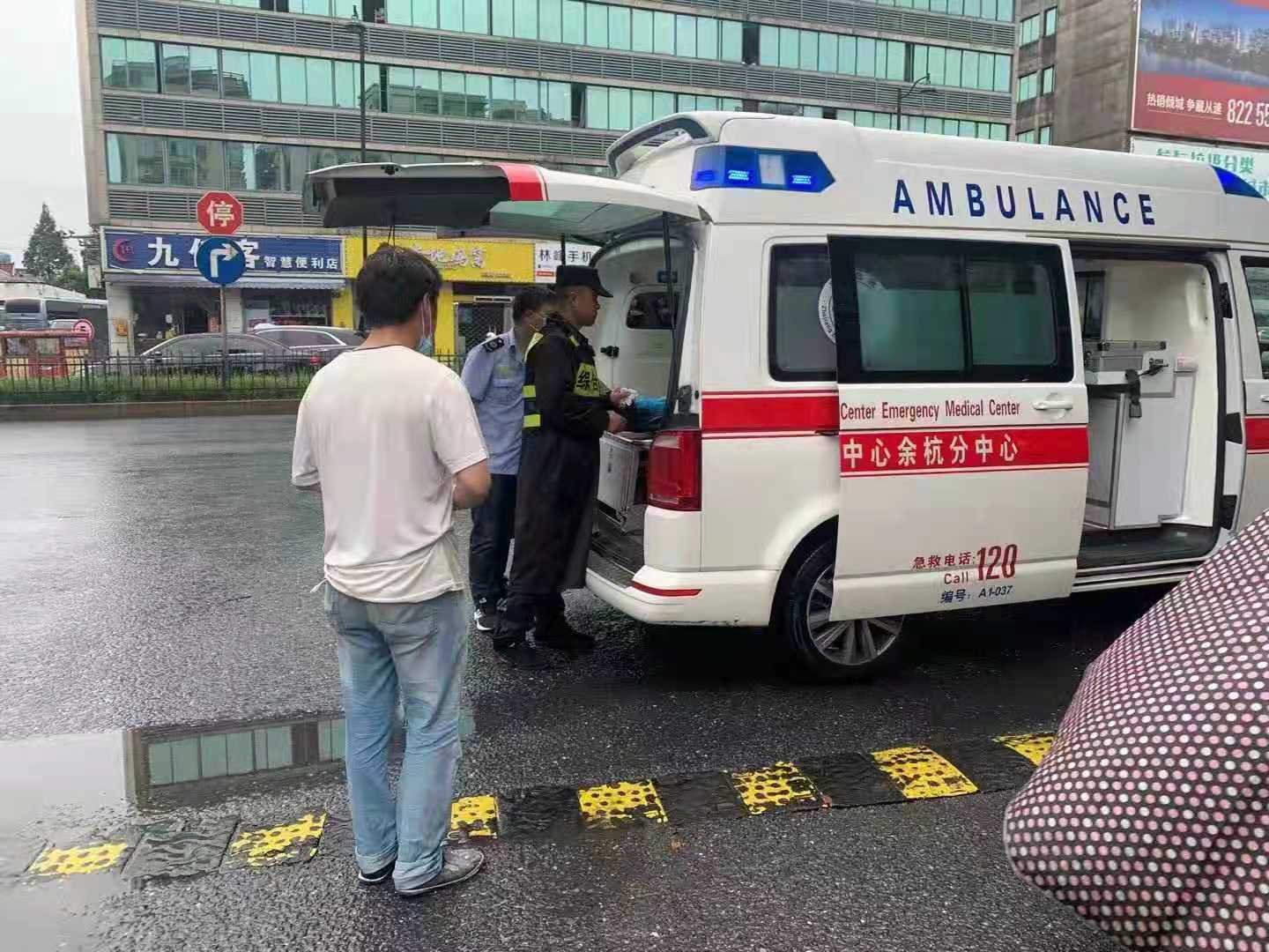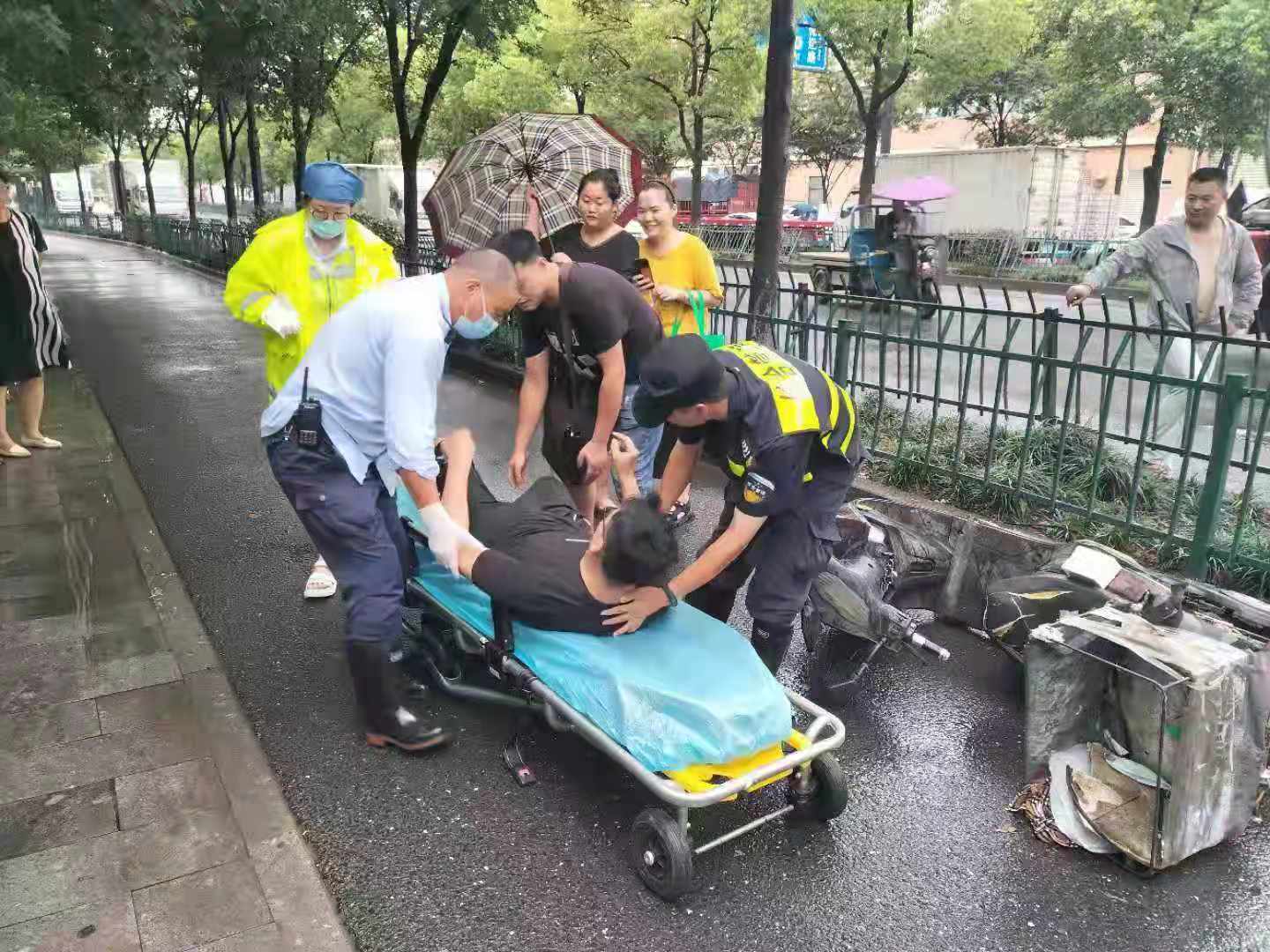 7月24日,浙江民泰良渚物流項(xiàng)目隊(duì)員幫助騎車摔傷男子及時(shí)就醫(yī)。