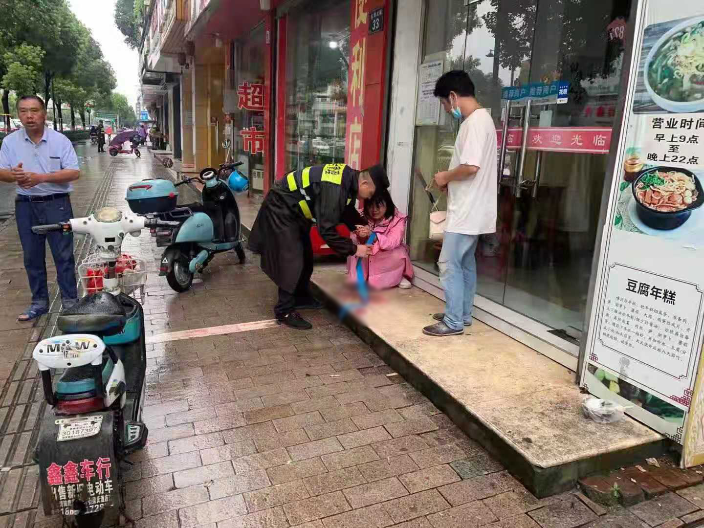 當(dāng)日9:15,受臺(tái)風(fēng)影響,天氣陰雨綿綿,路面積水濕滑。李建軍、沈明銳巡邏至東湖北路與星光街路口時(shí),看到一位騎電瓶車小姑娘摔倒在地,就立即上前查看。