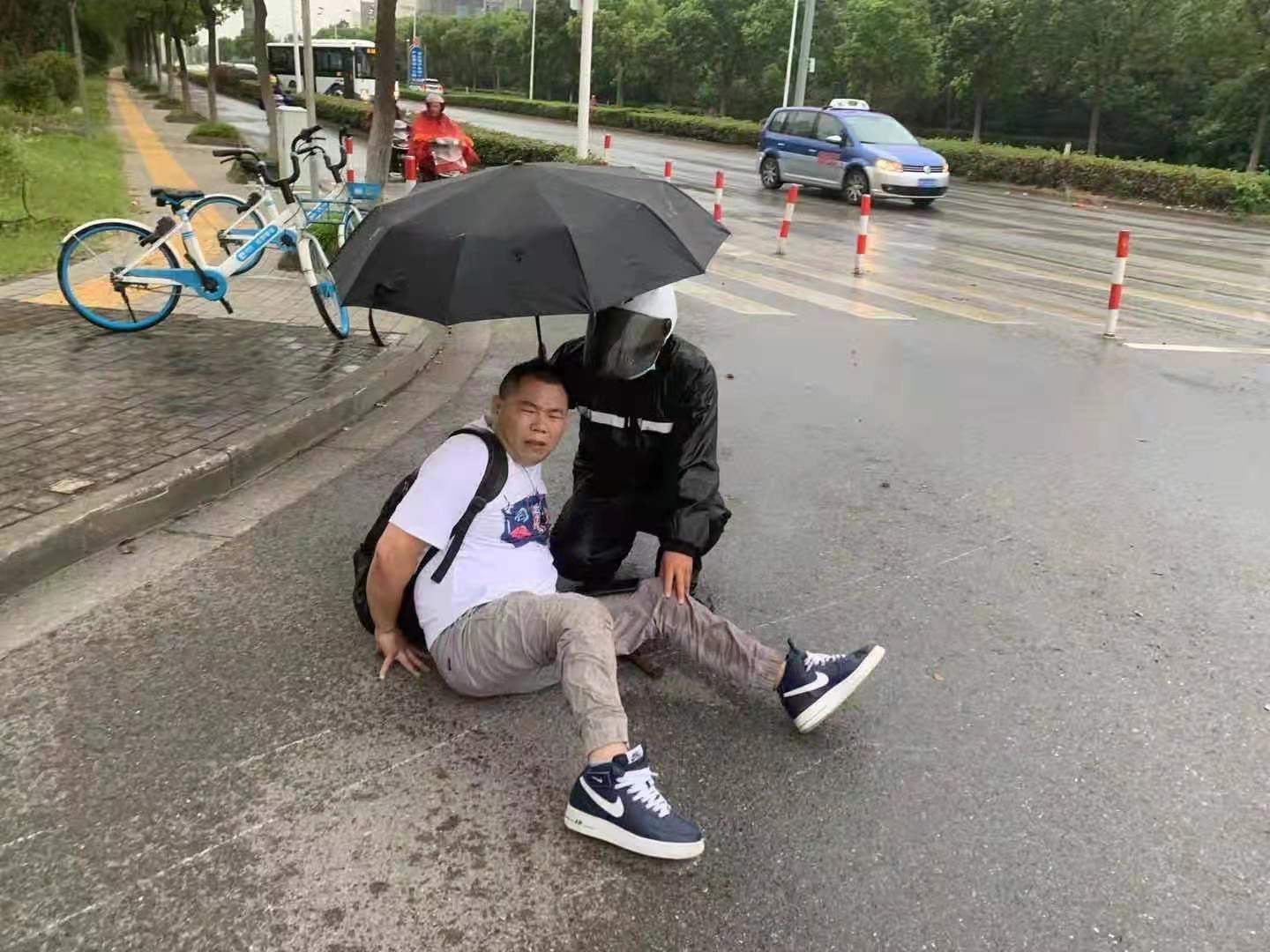 因事發(fā)地處在十字路口,路上來往車輛較多,且當(dāng)時(shí)正下著蒙蒙細(xì)雨。為避免路人圍觀,造成交通擁堵,何全義將男子慢慢攙扶到路邊,并為他撐傘擋雨。