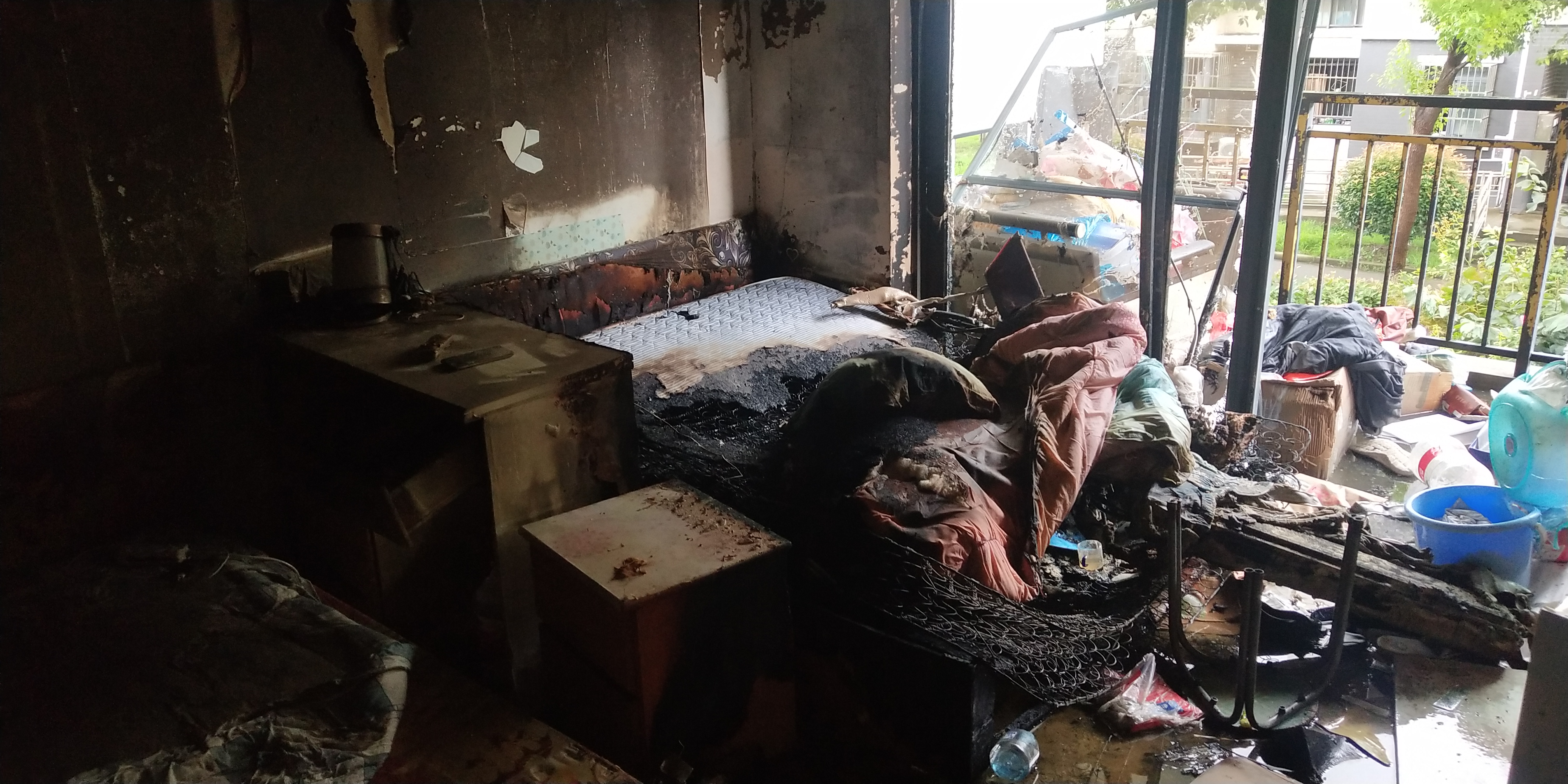 經(jīng)確認(rèn)現(xiàn)場沒有人員被困后,在現(xiàn)場保安人員的配合下,立即切斷電源開關(guān),鎖定房間床上物品著火源,利用樓道墻上消火栓對準(zhǔn)火源噴射,直至火源徹底熄滅。消防救援隊(duì)人員也很快趕到現(xiàn)場,社區(qū)微型消防站人員與他們進(jìn)行了交接,將現(xiàn)場滅火情況向他們作了匯報(bào)。