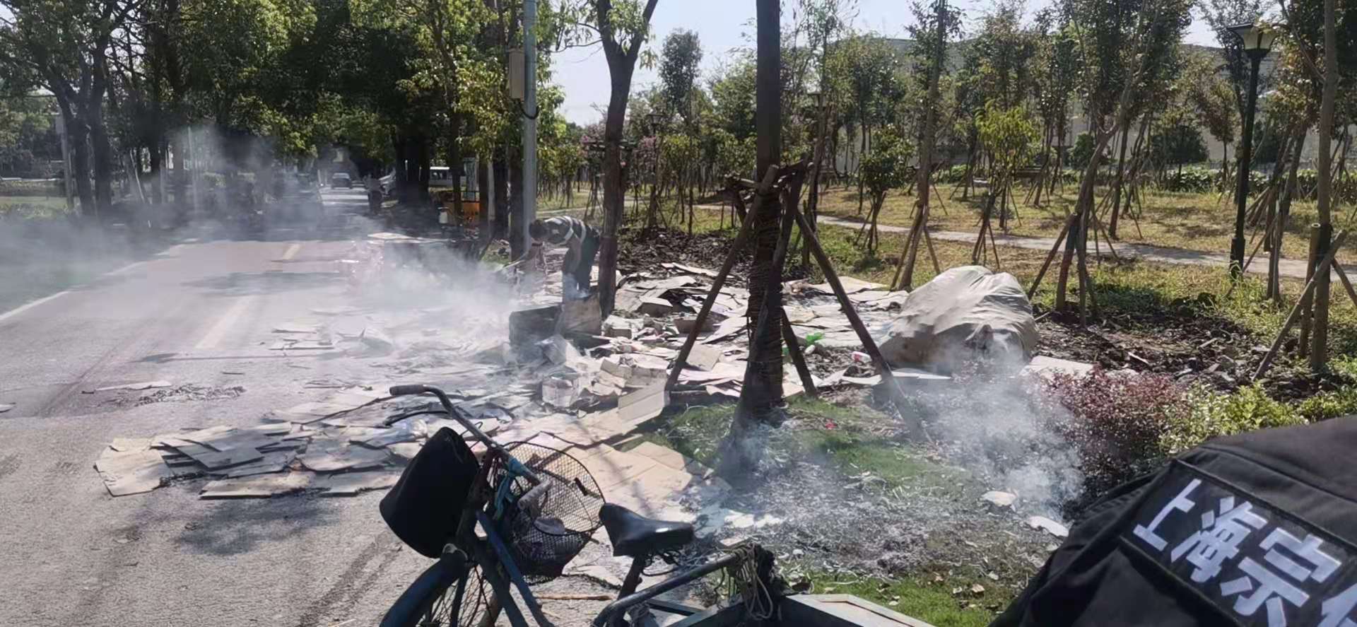 當(dāng)日9:26,界浜村消防站隊員在進行訓(xùn)練時,發(fā)現(xiàn)界浜村窯墩路上一輛行走的三輪車上的紙盒冒著黑煙,火苗直往上竄,而騎車的師傅沒有察覺。在這危急時刻,4名隊員馬上停止訓(xùn)練,帶上滅火器材奔到現(xiàn)場,迅速展開撲救。