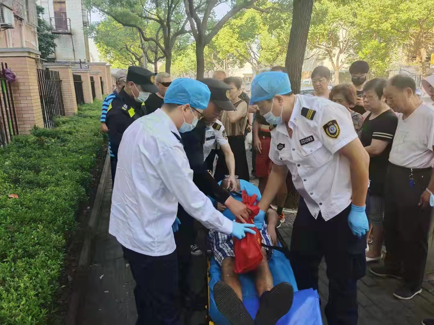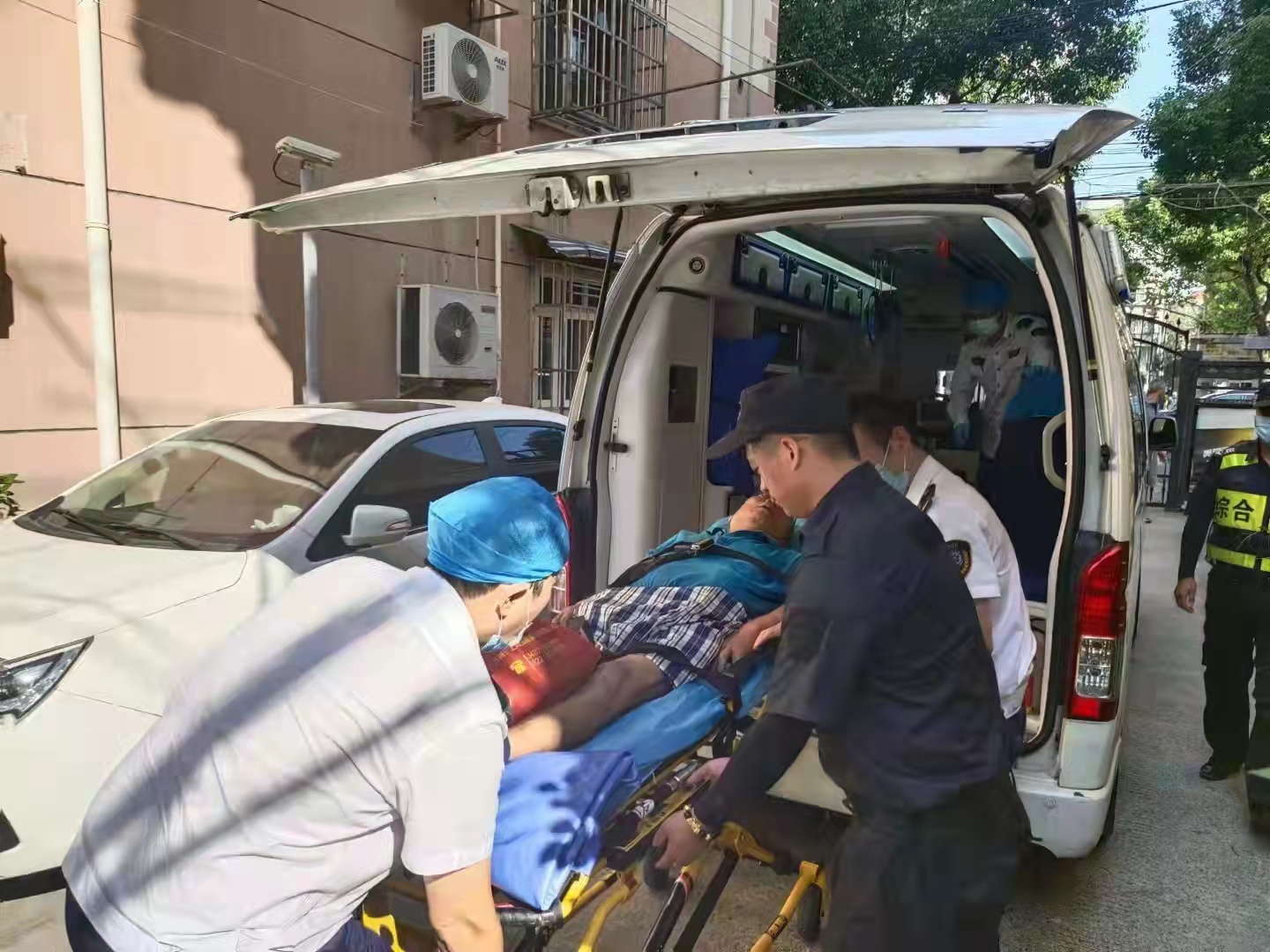 在等待救護車的過程中,劉大旺負(fù)責(zé)守在老人身邊,以防二次傷害,王龍祥則在現(xiàn)場負(fù)責(zé)維持秩序。很快,救護車趕到現(xiàn)場,兩人協(xié)助醫(yī)護人員將老人抬上救護車,送往醫(yī)院救治。