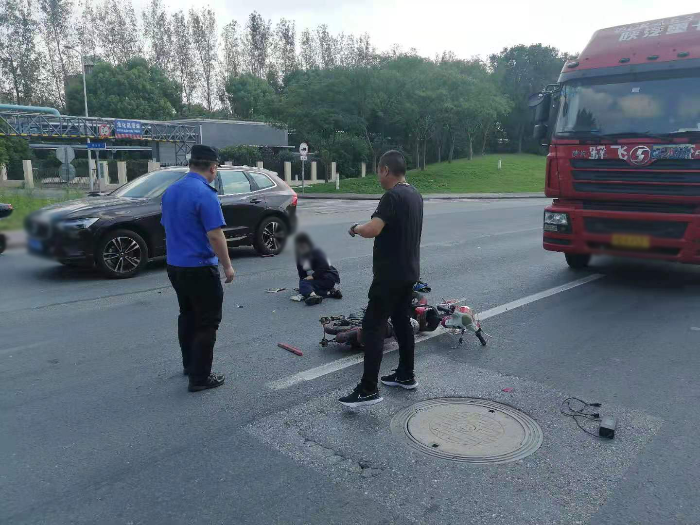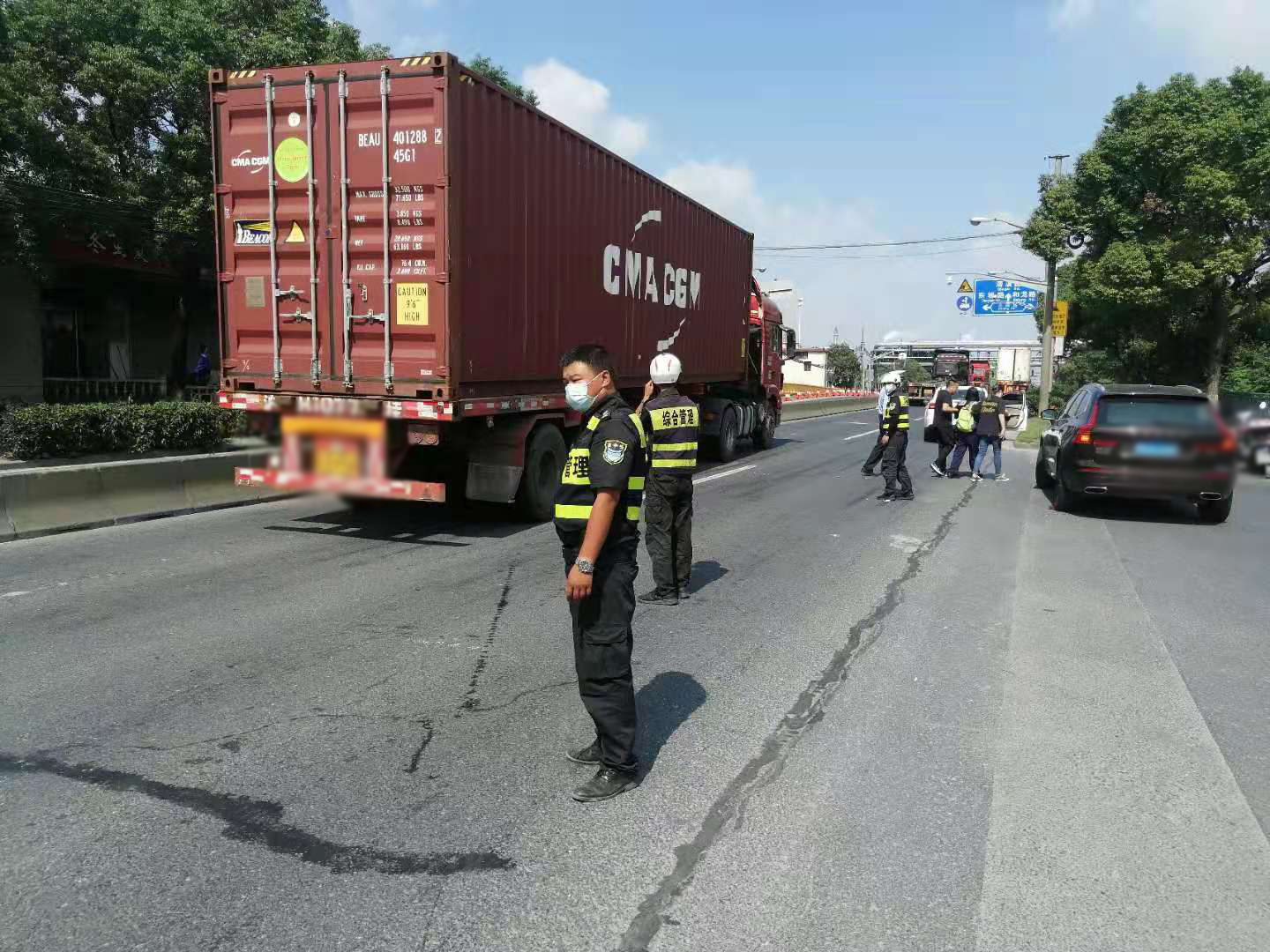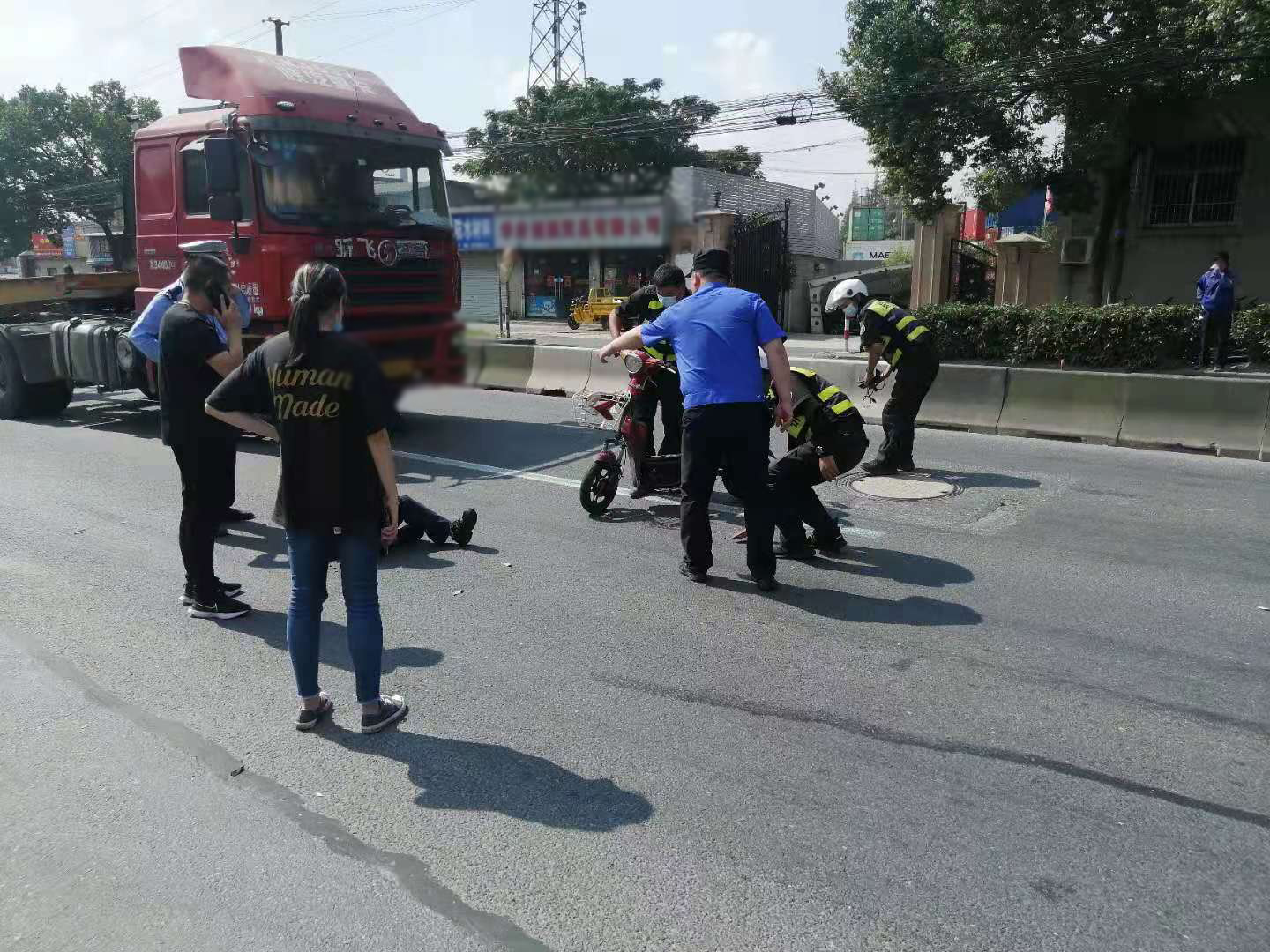 當(dāng)日10:00,陳睿、李旭龍、路標(biāo)、秦金奎在城管中隊(duì)執(zhí)法員益衛(wèi)華的帶領(lǐng)下,驅(qū)車在高橋鎮(zhèn)浦東北路高荷路路口巡邏時(shí),遇到一起交通事故,一輛集卡車與一輛電瓶車相撞,騎電瓶車女子癱坐在地上。