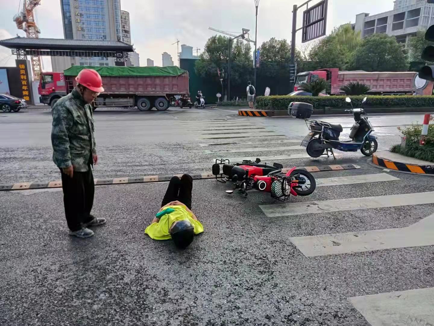 當(dāng)日9:15,嚴(yán)衛(wèi)基、張龍?jiān)陂e富中路巡邏時(shí),看到閑林街道辦事處門口有一名女子躺在地上,一輛電動(dòng)車摔倒在旁,一個(gè)男子正在和她說話。