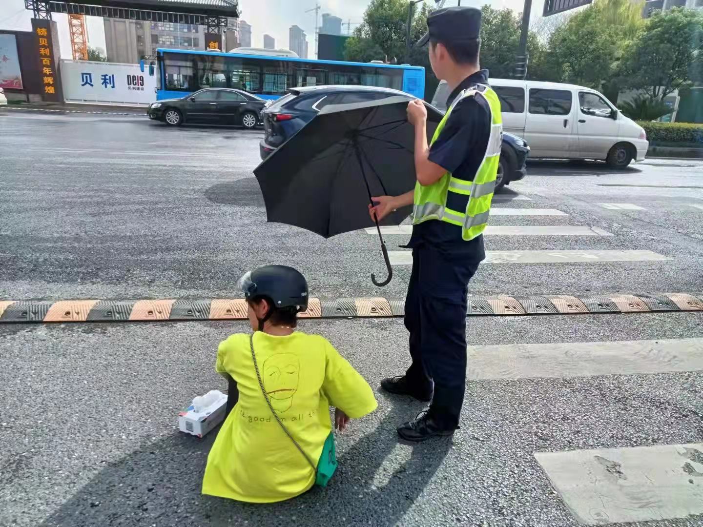 為防止發(fā)生二次意外,張龍立即在現(xiàn)場(chǎng)維持交通秩序,并將情況上報(bào)班組長(zhǎng)。嚴(yán)衛(wèi)基則負(fù)責(zé)看護(hù)女子,且在女子的請(qǐng)求下幫忙撥打了120急救電話。天氣炎熱,細(xì)心的嚴(yán)衛(wèi)基還特地借來一把遮陽(yáng)傘為女子遮擋烈日。