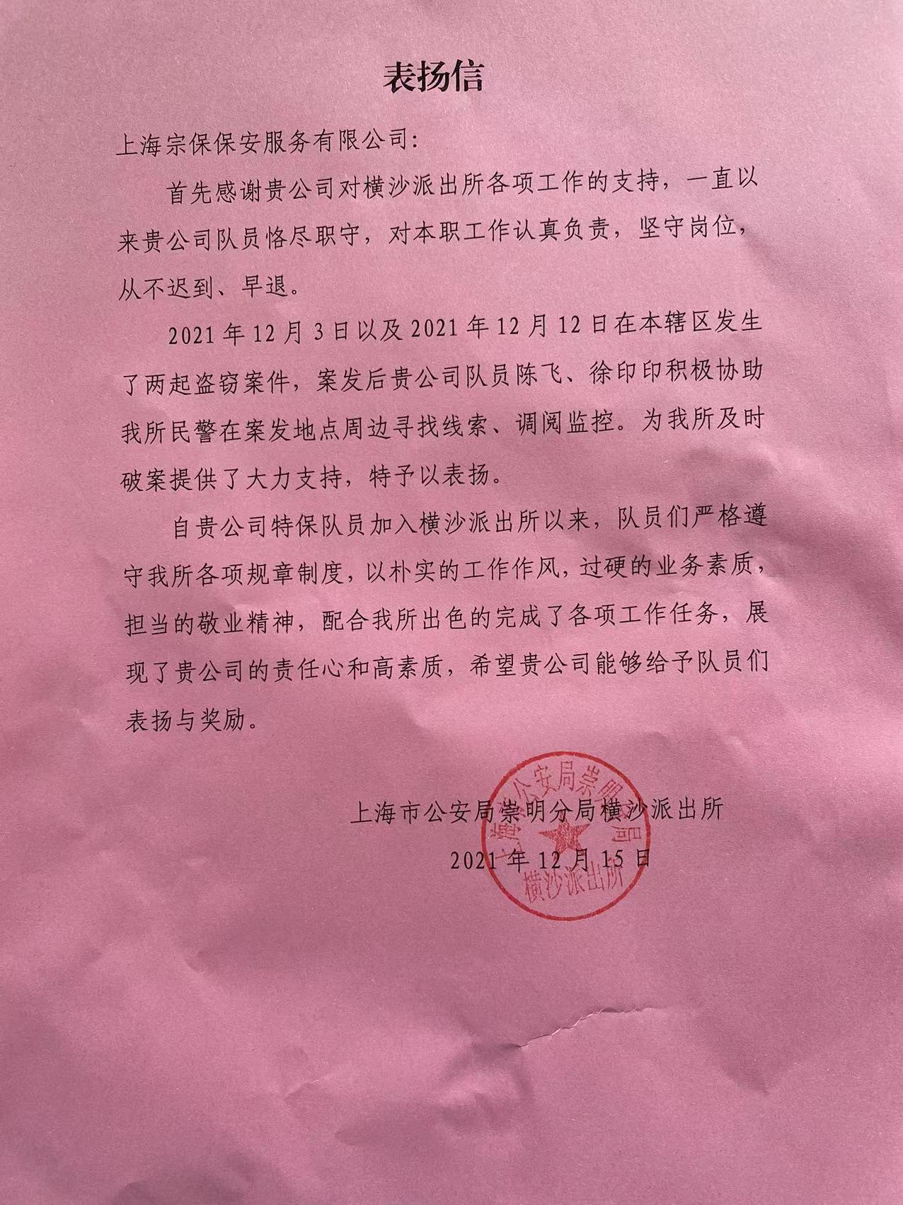 12月15日,宗保公司駐崇明區(qū)橫沙鄉(xiāng)項(xiàng)目收到崇明區(qū)公安分局橫沙派出所的表?yè)P(yáng)信,表?yè)P(yáng)恪盡職守、工作負(fù)責(zé)的宗保隊(duì)員。