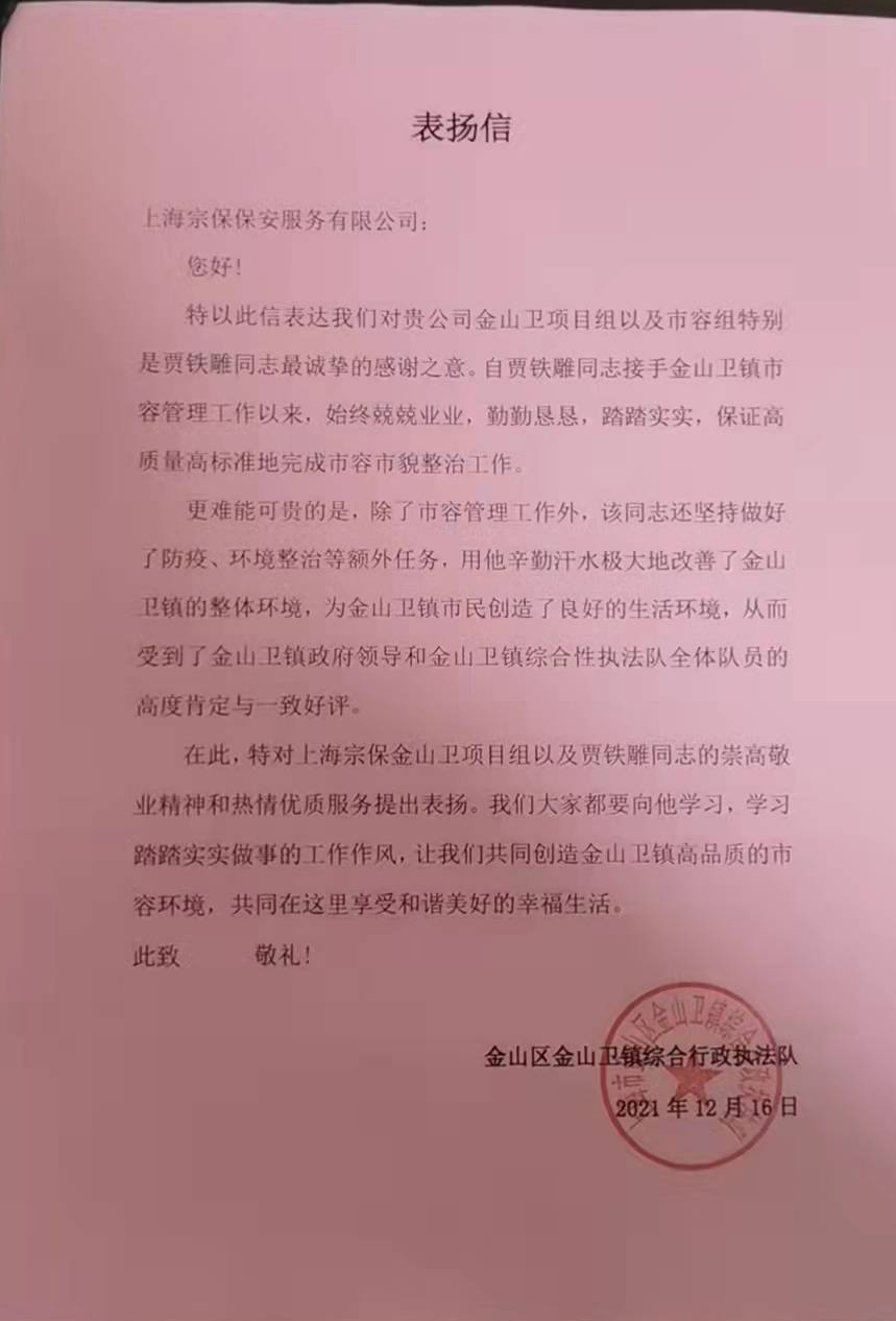12月16日,宗保公司駐金山衛(wèi)市容項(xiàng)目收到金山衛(wèi)鎮(zhèn)綜合行政執(zhí)法隊(duì)的表?yè)P(yáng)信,信中對(duì)宗保隊(duì)員賈鐵雕兢兢業(yè)業(yè)的工作表現(xiàn)提出特別表?yè)P(yáng)。