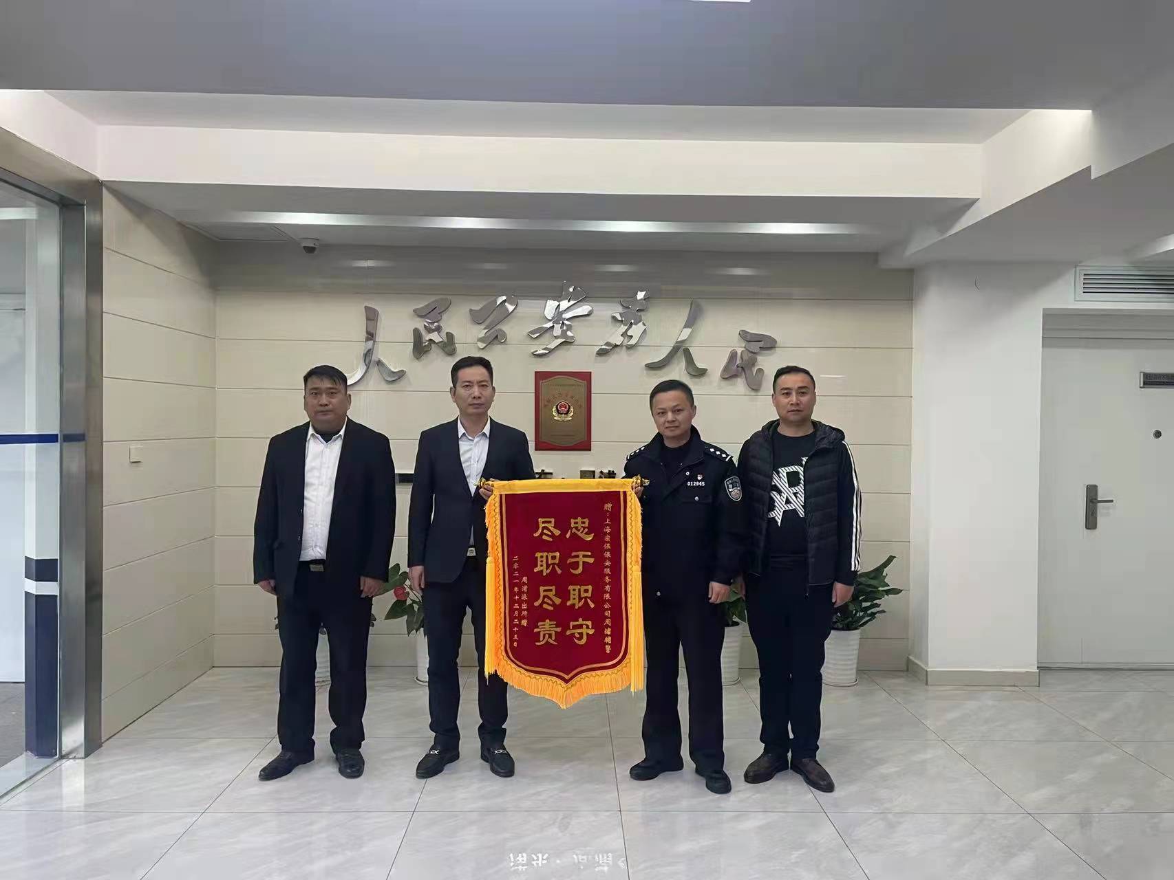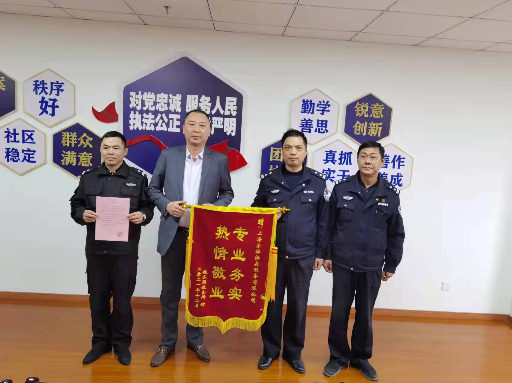 12月28日,浦東新區(qū)依水園派出所所長(zhǎng)施引軍和民警錢堅(jiān)強(qiáng)向公司副總經(jīng)理王耀和項(xiàng)目負(fù)責(zé)人宮建華贈(zèng)送繡有“專業(yè)務(wù)實(shí) 熱情敬業(yè)”的錦旗和表?yè)P(yáng)信,表?yè)P(yáng)項(xiàng)目特保隊(duì)員愛崗敬業(yè)、履職盡責(zé)的優(yōu)良表現(xiàn)。