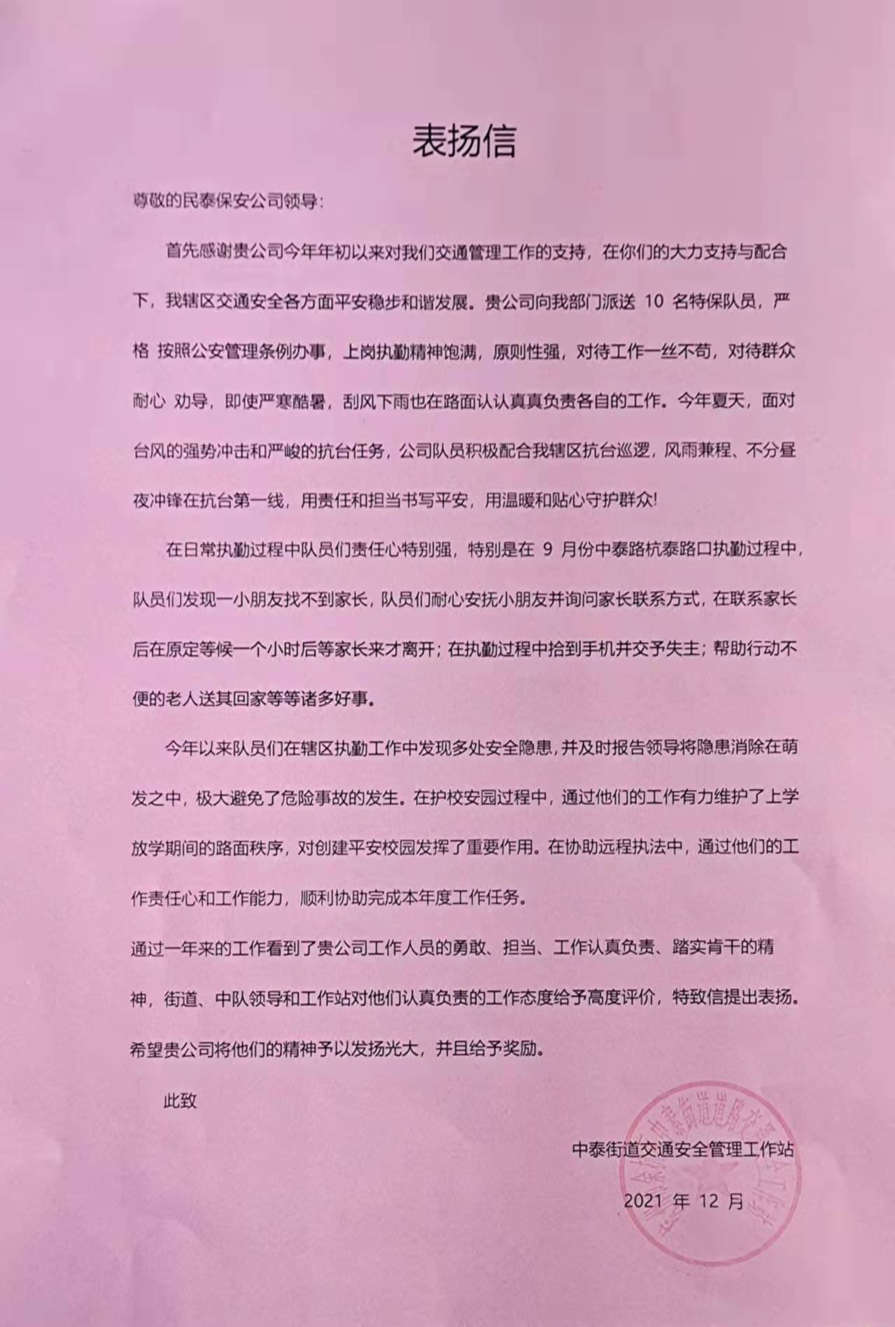12月28日,浙江民泰公司駐中泰交管輔助項(xiàng)目收到余杭區(qū)中泰街道交警工作站站長(zhǎng)王平、指導(dǎo)員應(yīng)海松的表?yè)P(yáng)信,表?yè)P(yáng)民泰員工盡心履職突出的工作表現(xiàn)。