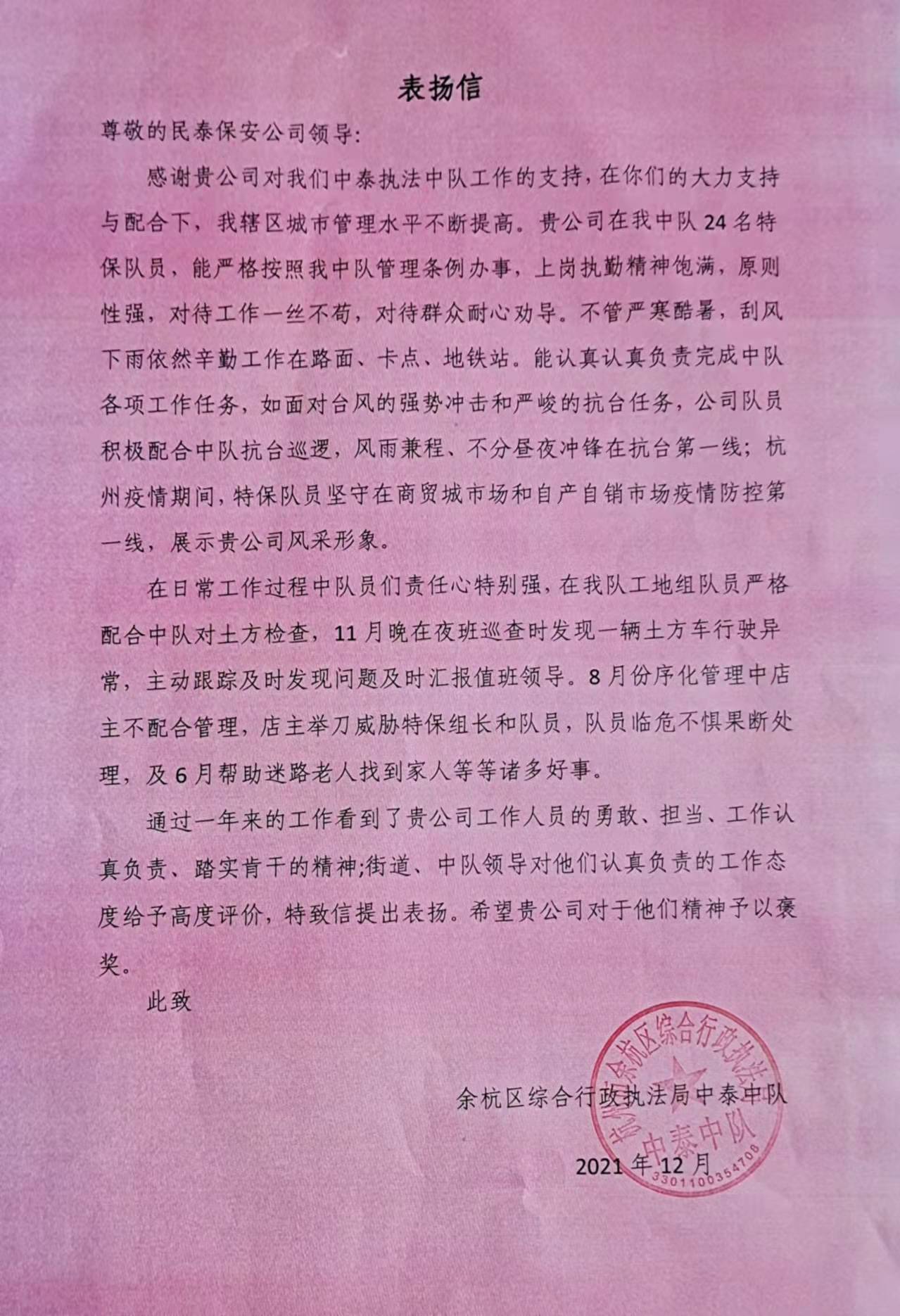12月29日,浙江民泰駐中泰城管輔助項(xiàng)目收到余杭區(qū)中泰街道城管中隊(duì)副中隊(duì)長(zhǎng)王哲送來的表?yè)P(yáng)信,信中對(duì)民泰隊(duì)員履職盡責(zé)的工作表現(xiàn)予以表?yè)P(yáng)。