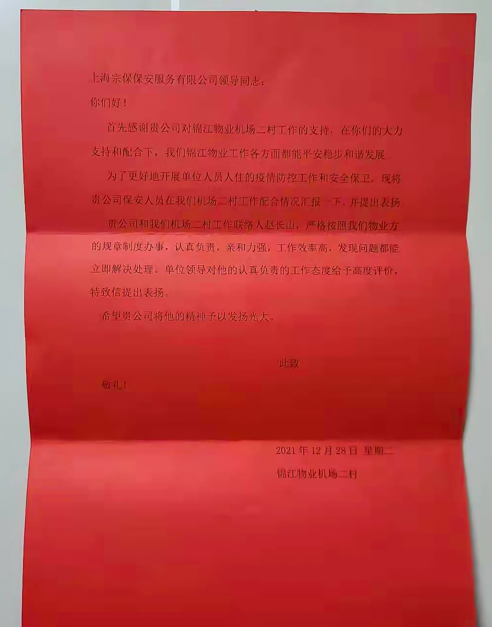 12月31日,錦江物業(yè)機(jī)場(chǎng)二村經(jīng)理莊敏和辦公室總監(jiān)孟銀行,將繡有“恪盡職守?zé)o私奉獻(xiàn) 抗擊疫情真心英雄”的錦旗和表?yè)P(yáng)信送到宗保公司機(jī)場(chǎng)防疫項(xiàng)目,感謝宗保公司對(duì)其工作的大力支持,表?yè)P(yáng)隊(duì)員趙長(zhǎng)山突出的工作表現(xiàn)。