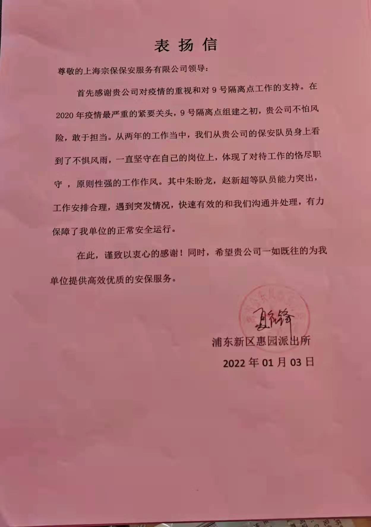 1月3日,宗保公司駐9號疫情防控隔離點項目收到浦東新區(qū)惠園派出所的表揚信,信中表揚宗保公司員工突出的工作表現(xiàn),感謝宗保公司對其工作的大力支持。