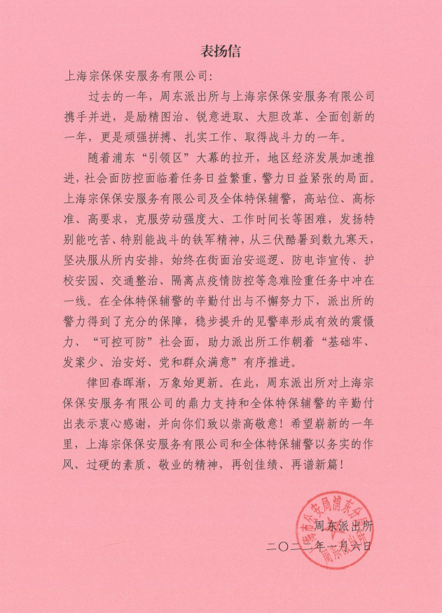 1月7日,宗保公司駐周東輔警項目收到周東派出所的表揚信,信中對宗保公司全體特保輔警的辛勤付出表示衷心感謝。