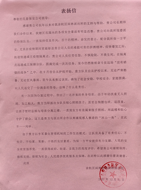 1月12日,民泰公司駐閑林輔警項目收到閑林派出所的表揚信,信中表揚民泰隊員出色的工作表現(xiàn)。