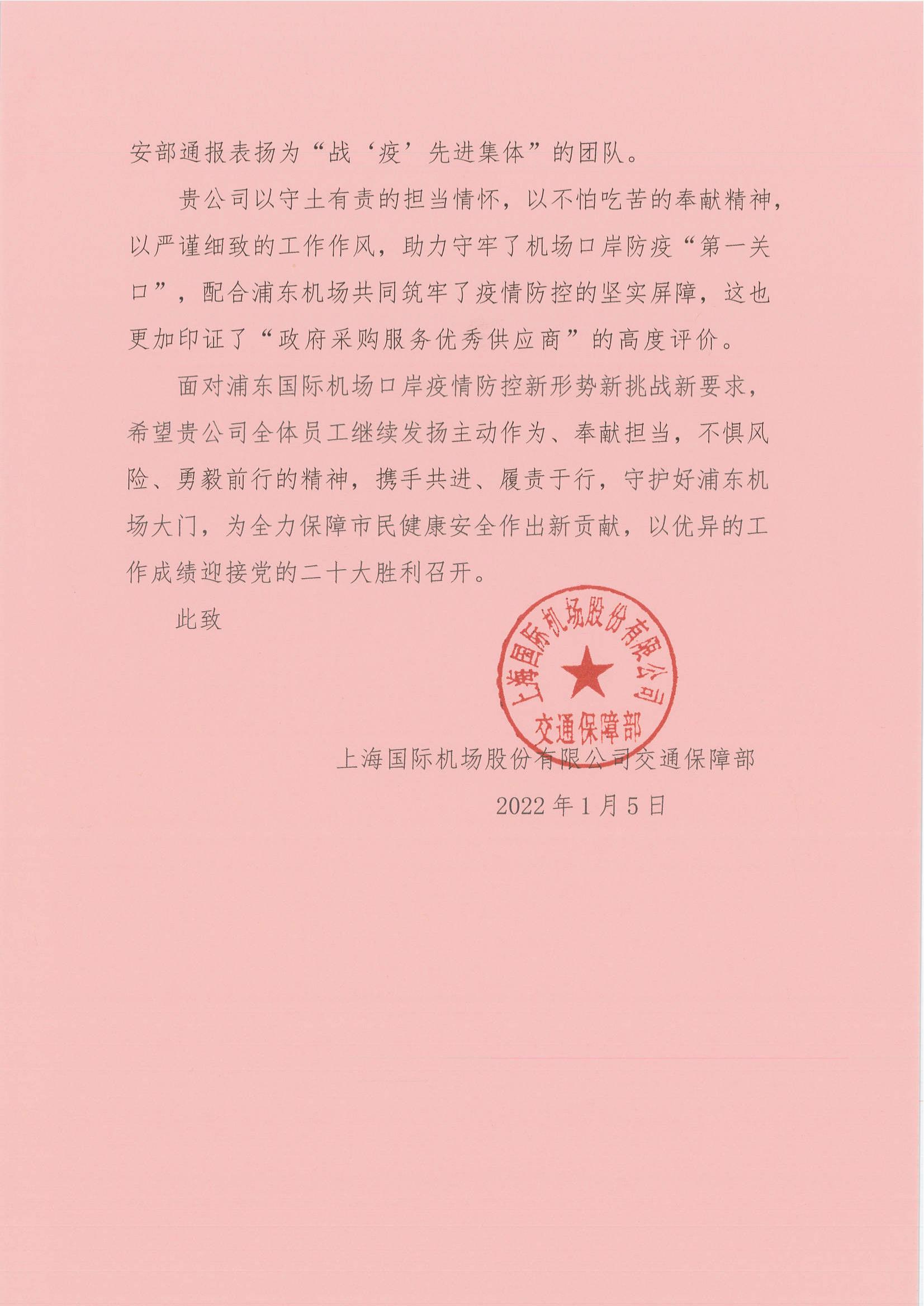 —上海國(guó)際機(jī)場(chǎng)股份有限公司交通保障部送來(lái)錦旗和感謝信