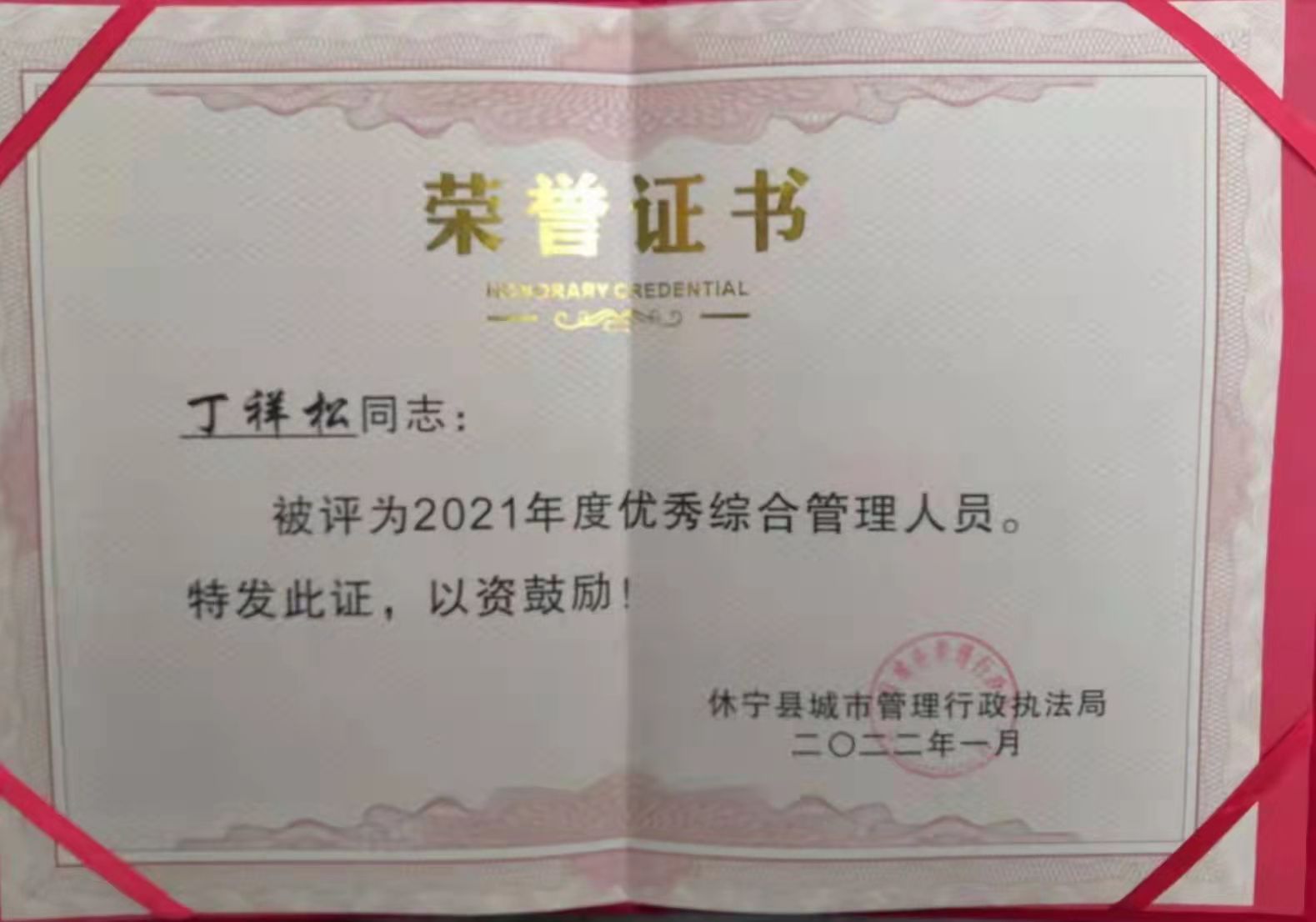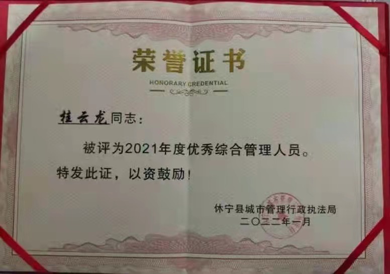 1月26日上午,休寧縣城市管理行政執(zhí)法局召開2021年度工作總結(jié)表彰部署會議,會上,公司駐休寧市容項目隊員桂云龍、丁祥松被評為2021年度優(yōu)秀綜合管理人員。